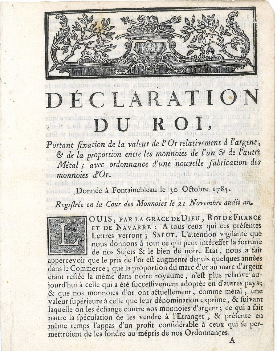 DÉCLARATION du Roi, portant fixation de la valeur d'or relativement à l'argent, et de la proportion entre les monnoies de l'un et de l'autre métal; avec ordonnance d'une nouvelle fabrication des monnoies d'or.