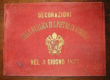 Album (cm. 24,5x17,5) contenente 15 tavole fotografiche (cm. 13x9,5) applicate su pagine in cartoncino rigido. Legatura ed. in piena tela rossa leggermente stinta, con piccola macchia d’inchiostro. Scritte oro e stemma papale sulla cop. anteriore. Ex libris araldico. Alcune fioriture all’interno.
