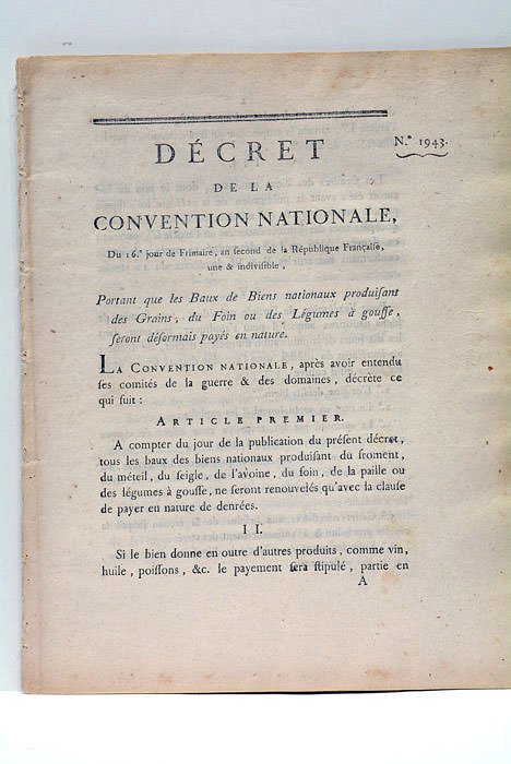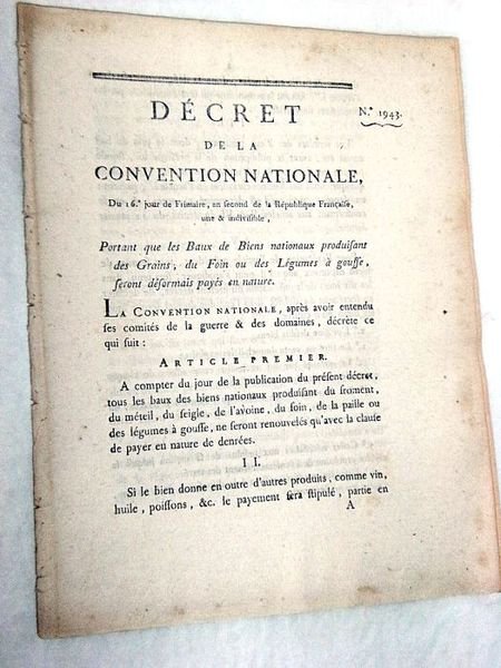 DÉCRET DE LA CONVENTION NATIONALE, du 16e jour de Frimaire, an second de la République Française, une et indivisible, portant que les baux de biens nationaux produisant des grains, du foin ou des légumes à gousse, seront désormais payés en nature.