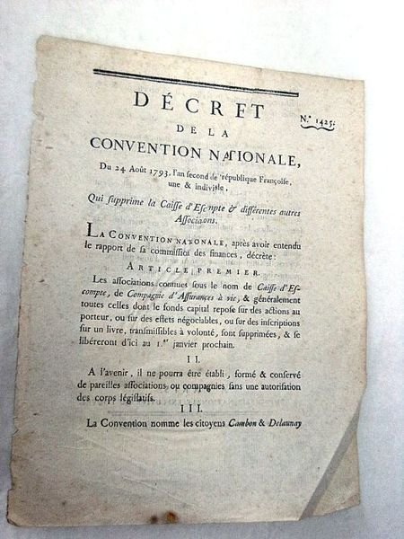 DÉCRET DE LA CONVENTION NATIONALE, du 24 août 1793, l'an second de la République Françoise, une et indivisible, qui supprime la Caisse d'Escompte et différentes autres Associations.