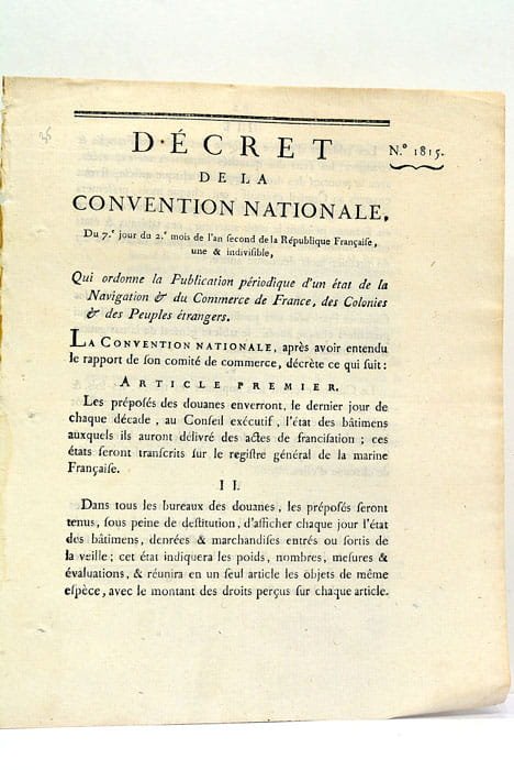Décret de la Convention Nationale, Du 7.e jour du 2.e mois de l'an second de la République Française, une et indivisible, Qui ordonnela Publication périodique d'un état de la Navigation et du Commerce de France, des Colonies et des Peuples étrangers.