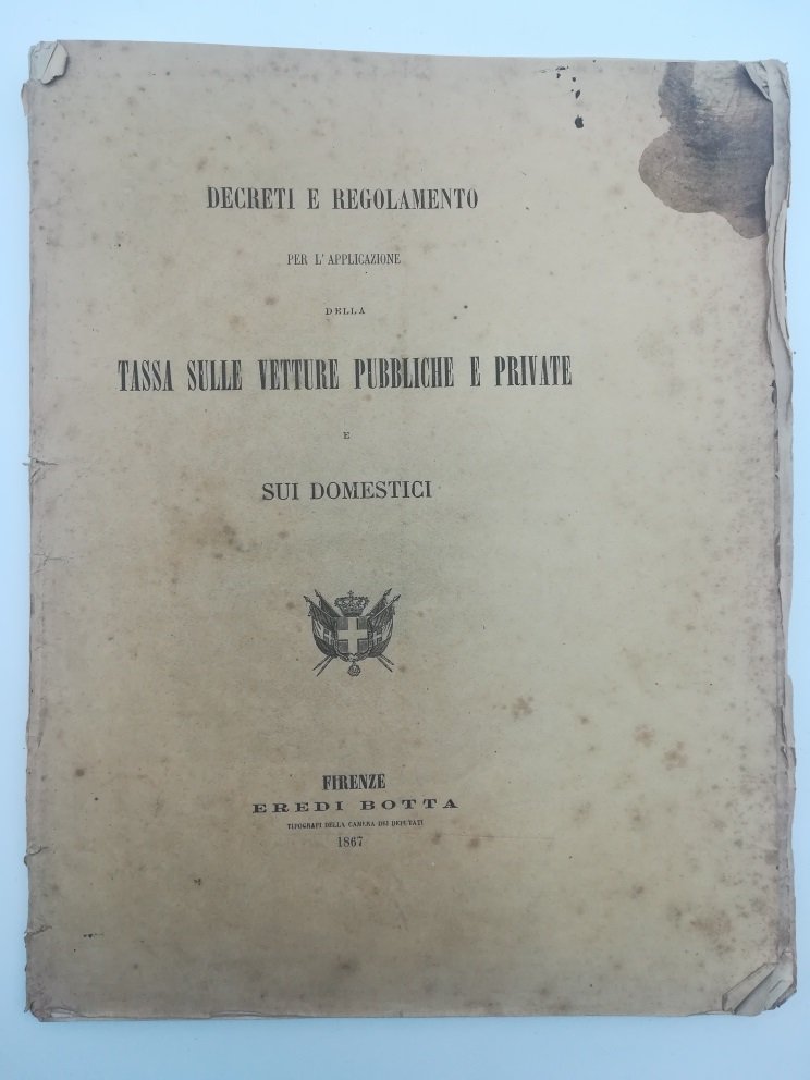 In 4, cm. 23 x 30, pp. 65. Brossura editoriale con evidenti segni del tempo, lievi bruniture e una gora all'angolo esterno superiore. Ddanni riparati al dorso, tagliIn buone condizioni. Il volume contiene: il Regio Decreto 28 giugno 1866 che stabilisce la tariffa delle tasse delle vetture e sui domestici; il Regio Decreto che approva il regolamento sulla tassa; regolamento per l'esecuzione del decreto; Lista dei Contribuenti; registro di consegna delle schede; certificato di avvenuta dichiarazione; Elenco; Registro per la consegna degli avvisi dei moduli.