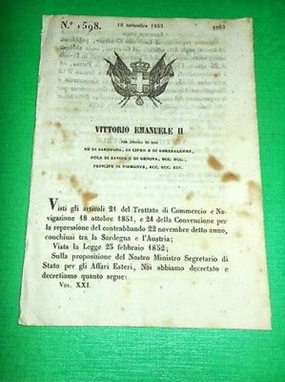 *** Atti del Governo di S. M. il Re di Sardegna: Raccolta n. 1598 del 1853 con riferimento agli atti di accettazione del trattato di Commercio e Navigazione stretto a Vienna tra il Re di Sardegna e l' Austria.Stupinigi, 18 Settembre 1853. Pagine 8.Per appassionati studiosi e collezionisti