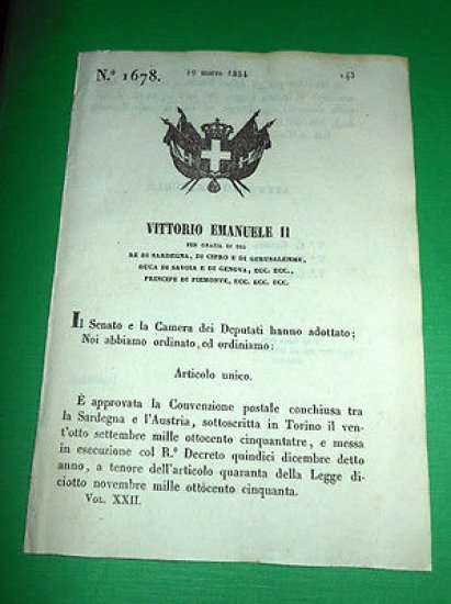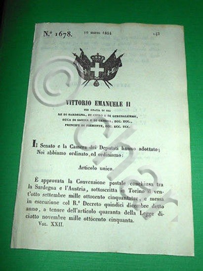 *** Atti del Governo di S. M. il Re di Sardegna: "Legge, colla quale si approva la convenzione postale conchiusa coll' Austria il 28 settembre 1853 ..."Torino, 19 Marzo 1854. Pagine 2.Per appassionati studiosi e collezionisti