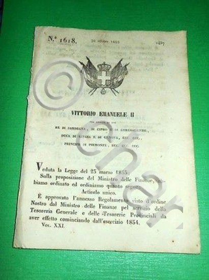 *** Atti del Governo di S. M. il Re di Sardegna: Raccolta n. 1618 del 1853 con riferimento al Regolamento per il Servizio delle Tesorerie generale e provinciali.Stupinigi, 30 Ottobre 1853. Pagine 54.Per appassionati studiosi e collezionisti