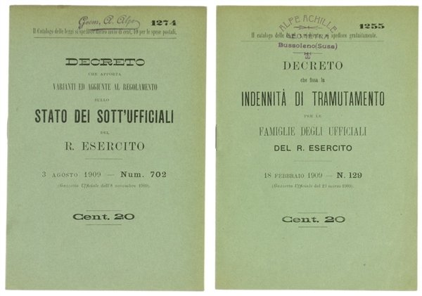 DECRETI RELATIVI ALLO STATO DEI SOTT'UFFICIALI DEL R.ESERCITO E ALL'INDENNITA' PER LE FAMIGLIE: due opuscoli. Decreti n. 129 e 702