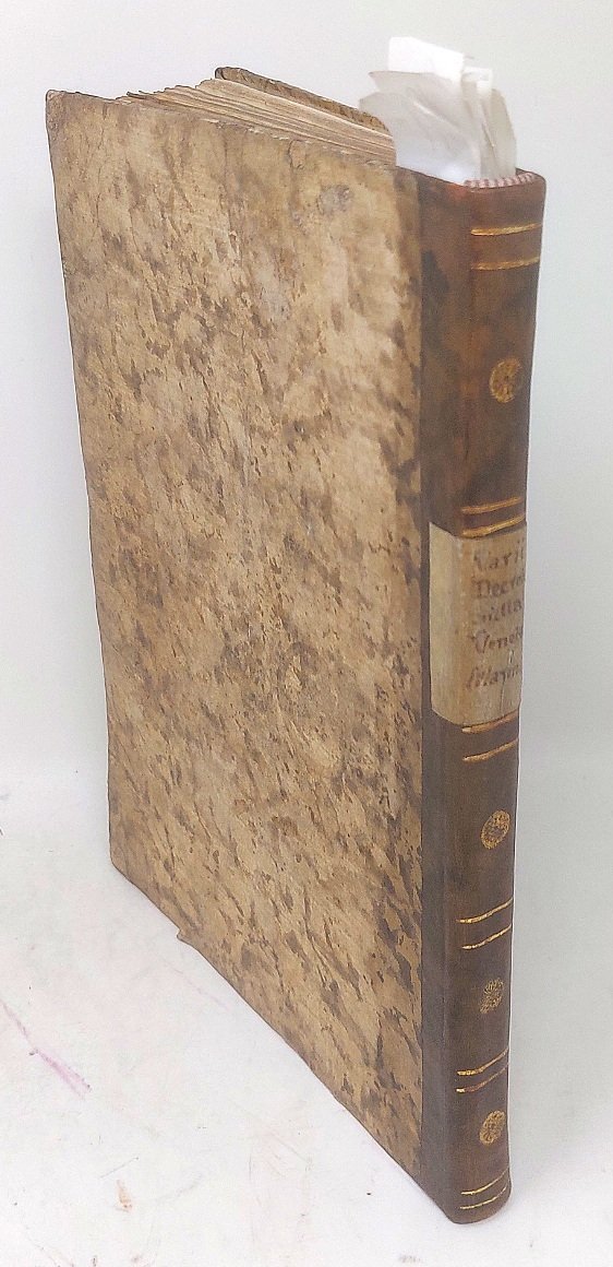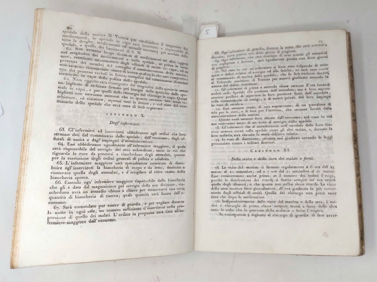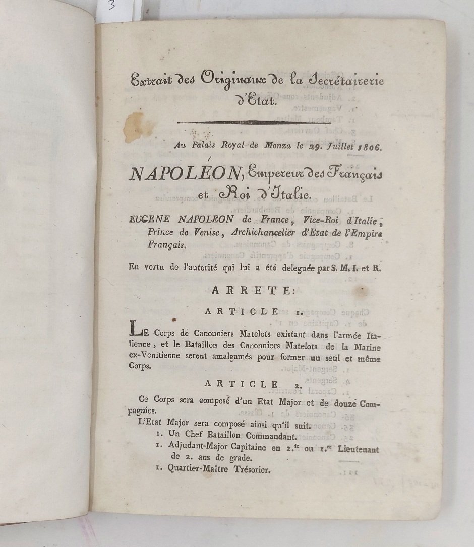 >Volume in-4, leg. del tempo m. pelle, titolo ms. su tassello in carta, fregi oro al dorso. Contiene 11 Decreti e Regolamenti riguardanti la Reale Marina Italiana, datati dal 1803 al 1812, per lo più emanati dal viceré Eugenio Napoleone durante l'annessione della Repubblica Veneta al Regno italico. - 1) Arrêté relatif à la solde de retraite et au traitement de reforme dans la Marine, 29-8-1803, pp. 12. - 2) Extrait des originaux de la Secrétairie d'Etat..., 29-6-1806, pp. (4). - 3) Regolamento per la Casa di Arresto della Marina nel Porto di Venezia, 29-10-1808, pp. 11. - 4) Regolamento per servigio dello spedale della Marina, s.d., pp. 34.- 5) Regolamento sopra li consumi, e li rimpiazzamenti di munizioni..., s.d., pp. 10.- 6) Decreto che determina il modo di pagamento degli Ufficiali militari..., 18-2-1801, pp. 9. - 7) Décret impérial relatif aux cérémonies publiques..., 13-7-1804, pp. 47.- 8) Décret impérial relatif aux honneurs militaires dans les ports et arsenaux de la Marine, s.d., pp. 23.- 9)Décrêt relatif à la composition et à l'organisation du corps des Officiers, 29-1-1812, pp. 11.- 10) Decreto di Napoleone I ed Eugenio Bonaparte, 27-2-1806, pp. 37.- 11) Le Ministre de la Marine et des Colonies. Reglement sur les emmenagemens des vaisseaux, des fregastes, et des brigs..., s.d., pp. (4), manoscritte. Interessante assieme. Buon esemplare; ex libris al contropiatto anteriore: "Maurocenorum Comitum", colorato a mano.