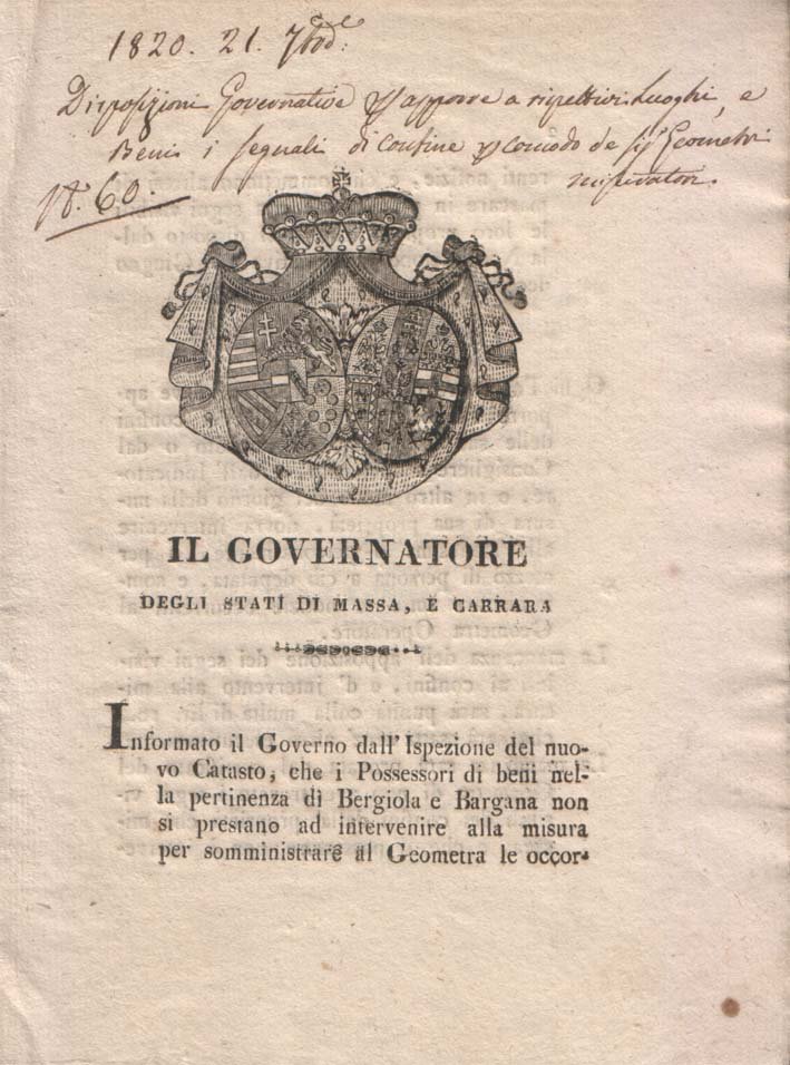 Decreto a firma del Governatore degli Stati di Massa e Carrara Petrozzani che intima ai possessori di beni nelle pertinenze di Bergiola e Bargana di rispettare le disposizioni per la formazione del nuovo catasto