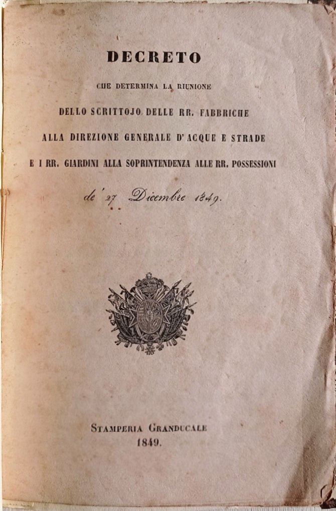 Decreto che determina la riunione dello scrittojo delle RR. Fabbriche alla direzione generale d'acque e strade e i RR. Giardini alla Soprintendenza alle RR. possessioni de' 27 dicembre 1849.