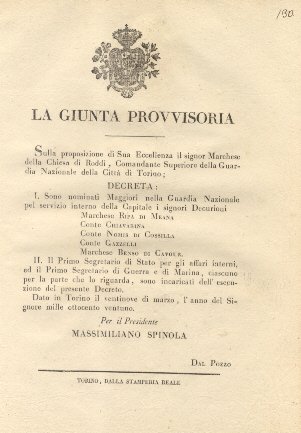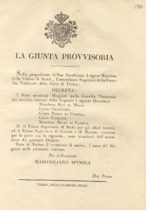 Decreto della Giunta Provvisoria con il quale nomina cinque signori Decurioni a Maggiori nella Guradia Nazionale per servizio interno della Capitale.29 marzo 1821.