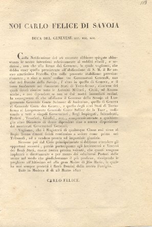 Decreto di Carlo Felice di Savoja nel quale si nominano provvisoriamente tre Governatori Generali, uno nel Ducato della Savoia, l'altro in quello di Genova, e il terzo finalmente nei rimanenti Stati di Terraferma, ciascuno dei quali dovrà riunire tutte le Autorità Militari, Civili, ed Economiche e non dipendere se non dai nostri immediati ordini . 23 marzo 1821.