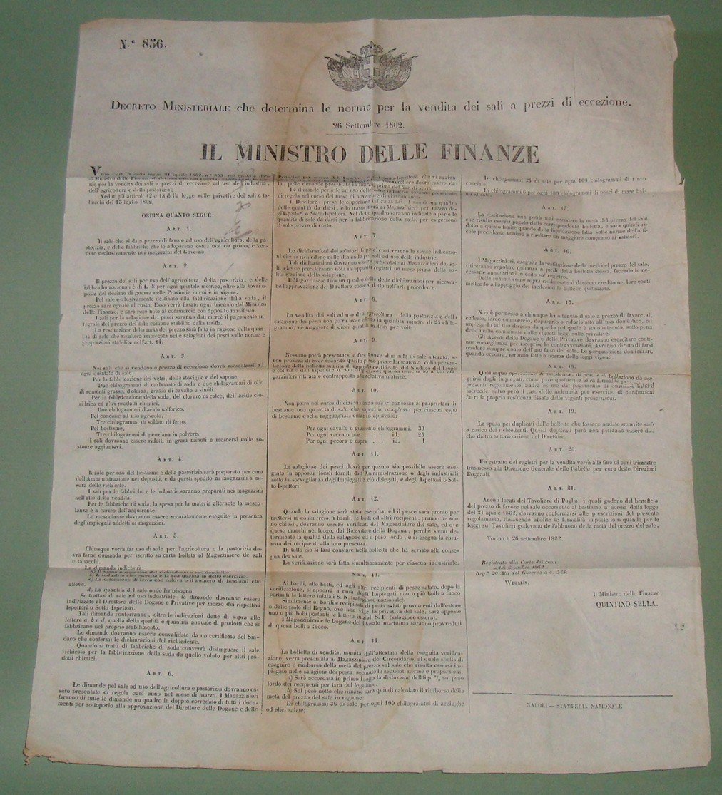 Decreto Ministeriale 26 Settembre 1862 firmato Quintino Sella. Il Ministro delle Finanze. Norme per la vendita di sale a prezzo d'eccezione. Stemma reale. Napoli, Stamperia Nazionale. Cm.50x40. Numerato 856.