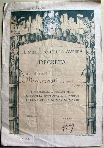 Autorizzato a fregiarsi della Medaglia istituita a ricordo della Guerra Mondiale 1915 - 1918. Roma 29 Maggio 1921. Splendido decreto con fregi di Duilio Cambellotti. Editori Alfieri & Lacroix - Roma - Milano. Documento. 35x47. Buonissimo stato. , Buono (Good)