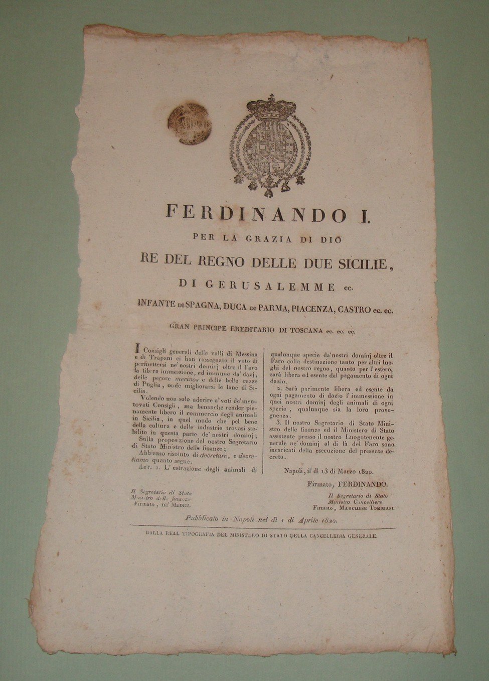 Decreto pubblicato a Napoli il 13 marzo 1820.