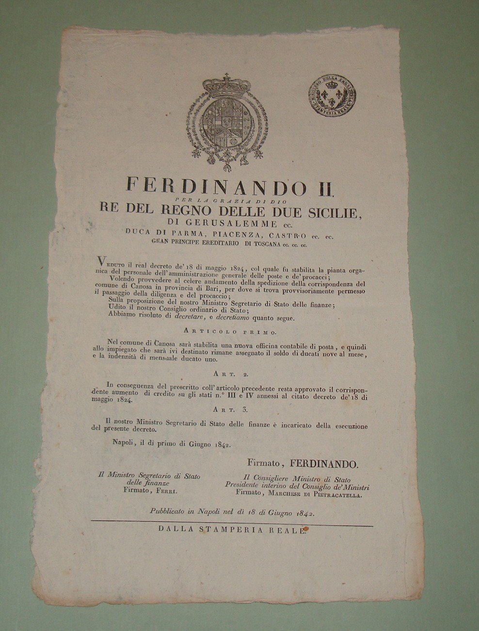 Nel comune di Canosa in provincia di Bari sarà stabilito una nuova officina contabile di posta. Un foglio in 4to. Stemma borbonico.