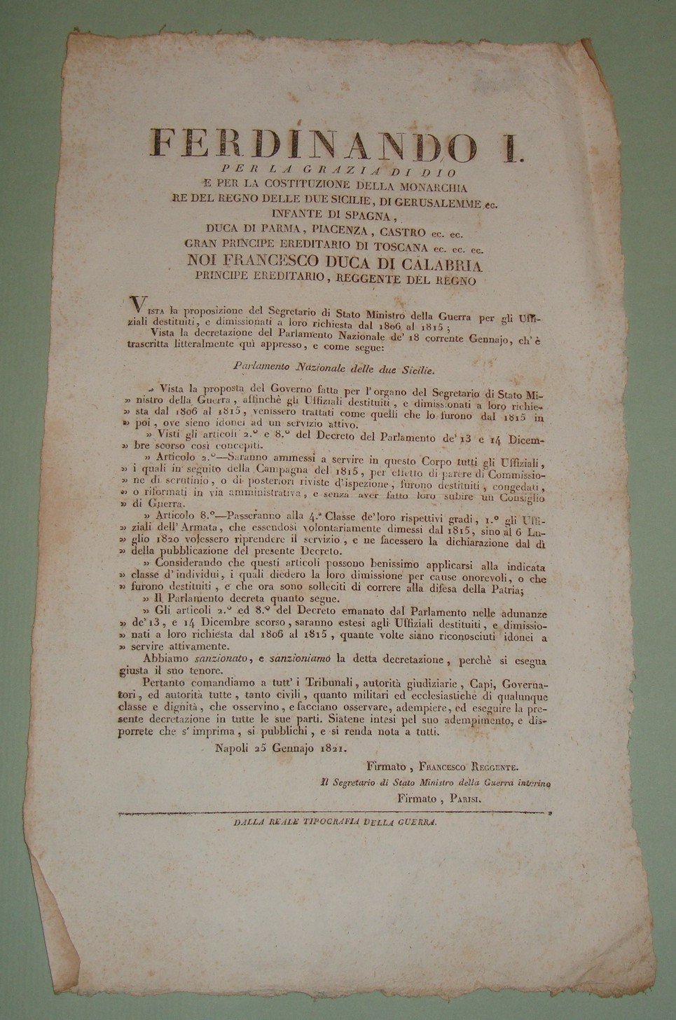 Decreto pubblicato a Napoli il 25 Gennaio 1821.