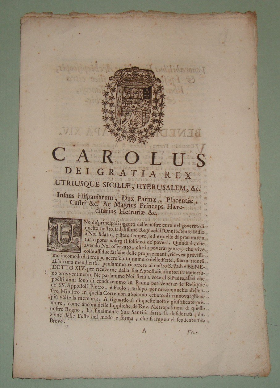 Serafino Porsile Regio Stampatore. Regolamentazione civile di alcune feste religiose. Un fascicolo in 4to; pp.8. Stemma borbonico.