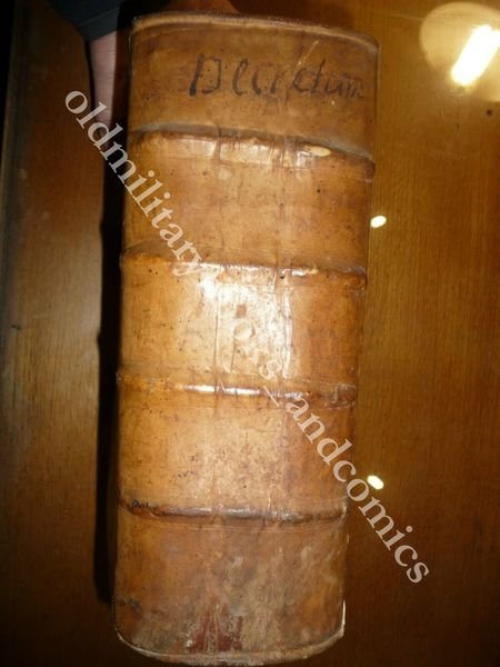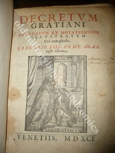 TITOLO: DECRETUM GRATIANI EMENDATUM ET NOTATIONIBUS ILLUSTRATUM UNA CUM GLOSSIS, GREGORIO XIII PONT. MAX DESCRIZIONE: Venezia 1591, pergamena 4 nervi al dorso, pp. (86) + 1904 + (28) in 4°. Frontespizio a caratteri neri e rossi, vignetta calcografica raffigurante papa Gregorio XIII, glosse e capilettera ornati. Contiene anche i Canones Poenitentiales (parte della Summa Aurea di Enrico Susa), ed i Canones Apostolorum (erroneamente attribuiti a Clemente I) Dedica di Ascanio Colosini al patriarca di Venezia Lorenzo Priolo. CONDIZIONI: Buone, piatto ant. con alcune abrasioni tarli alla prima pagina, che non intressano ne titolo ne la vignetta, tarli alla fine del vol. (6 pagg.) che fortunatamente con ledono la parte scritta. Piccola mancanza al piatto post. Modesto allentamento del vol. a circa metà dello stesso. PESO / WEIGHT: 3500 gr. without package