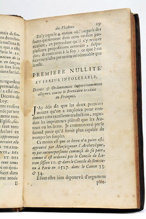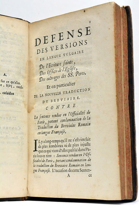 3 feuillets. 340 pages. (16,5x10 Cm). Plein veau brun. Dos à nerfs orné. Coins émoussés. Rousseurs éparses. Mouillure claire dans la marge du fond des premiers feuillets. Edition très rare de cet ouvrage d’Antoine Arnauld, dit le Grand Arnauld. Le célèbre controversiste y prend la défense des traductions en français des textes sacrés, qui avaient fait l’objet de diverses condamnations par l’autorité ecclésiastique. Arnauld ne limitait pas son temps à l’étude des questions purement théologiques: En philosophie, il peut être considéré comme un représentant critique du cartésianisme ne défendant pas de doctrine propre, mais s'attachant à déceler les erreurs des autres. La qualité de ses objections établit tout de suite sa réputation de penseur éclairé et critique du nouveau système. Bon exemplaire.