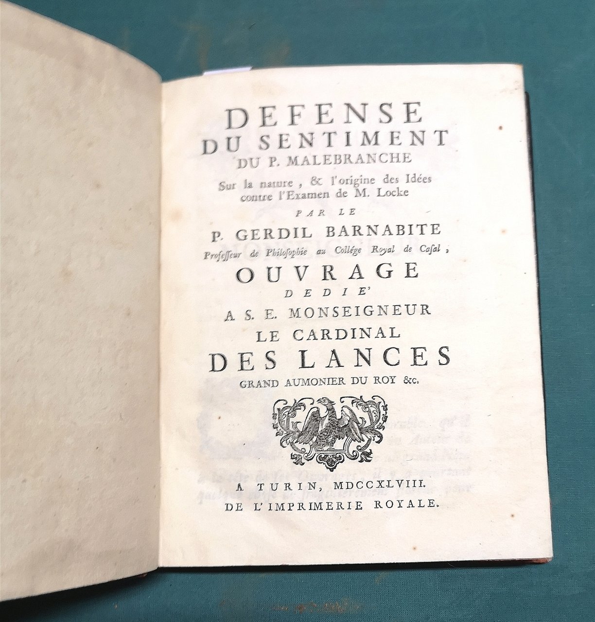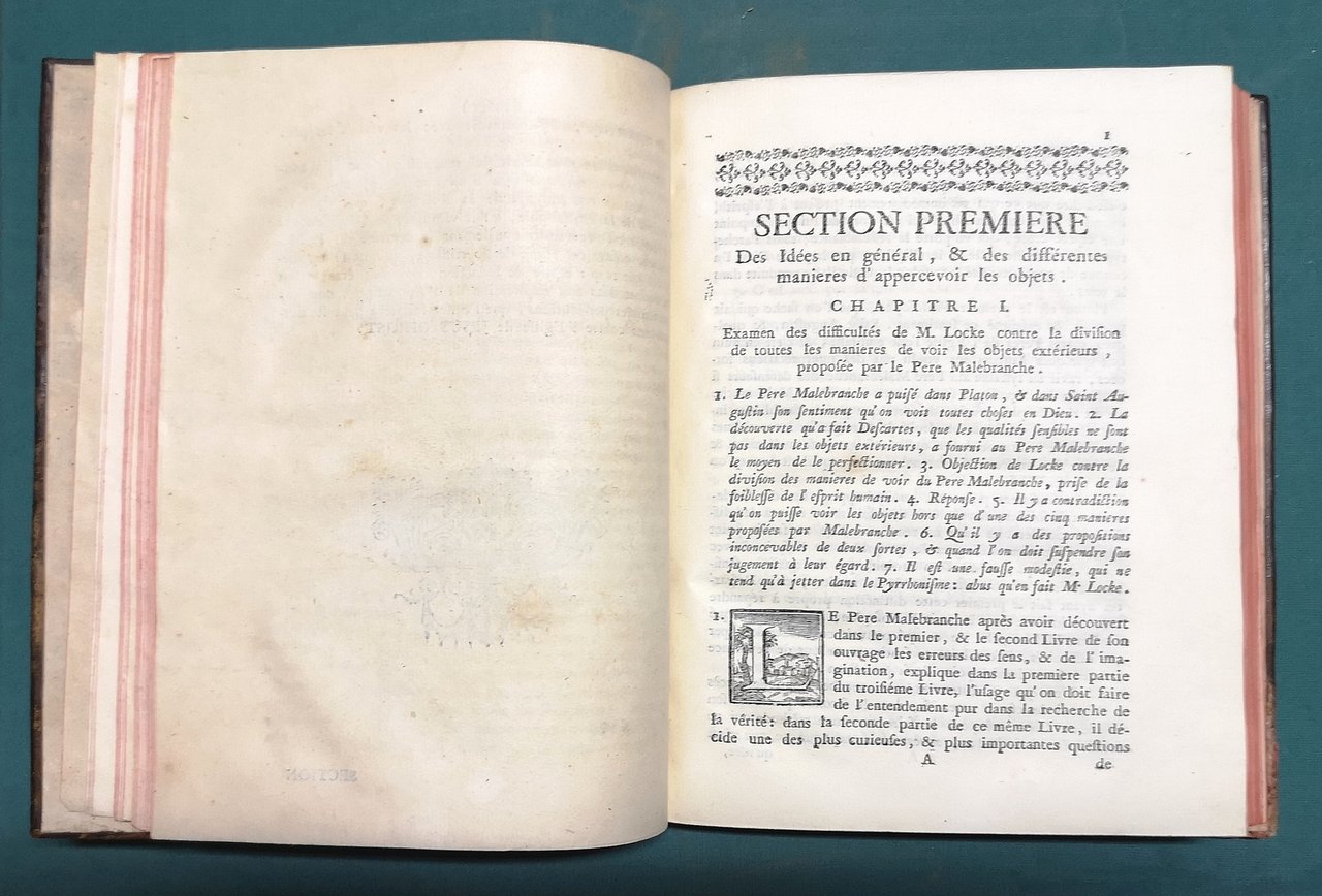 >in-8, pp. (16) XXXIX, (1), 246, (22); frontespizio ornato da vignetta, iniziali ornate, testatine e finalini in xilogr. Legatura coeva in p. vitello, titolo e fregi in oro al dorso a nervi, dentelles dorate, tagli rossi. Edizione originale. Seguace della filosofia di Malebranche, Gerdil la difese contro Locke in questo e nel suo altro celebre trattato (L'immatérialité de l'âme démontrée contre Mr. Locke, 1747). Curiosamente, nel presente esemplare, tra le pp. 8 e 9 non numerate sono stati legati 8 ff. provenienti proprio dalla prima edizione de "L'Immatérialité...", le pp. 267-282 sono la conclusione dell'opera e trattano "...l'explicaion de la fixité de l'air...". Ottimo esemplare.