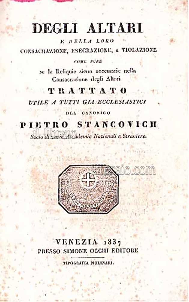 in 16°; pp. 190 + 1 tav. (più volte ripiegata); leg. in mezza tela coeva, tagli spruzzati di rosso, piatti marmorizzati. Stancovich Pietro funzionario pubblico istriano (Barbana 1771 - 1852), fu senza dubbio una delle personalità istriane più interessanti tra la fine del XVIII sec. e la prima metà del XIX: canonico e storico dell'Istria, sacerdote e scrittore, polemista, ricercatore curioso (s’interessò di archeologia), inventore di macchine agricole. Bibliofilo e collezionista, la sua grande biblioteca, con oltre 4000 volumi, è conservata nella città di Rovigno con il nome di "Stancoviciana". Scrisse numerosi libri su svariati argomenti: teologici, storico-biografici, archeologici, scientifici e si dilettò anche in alcune posie