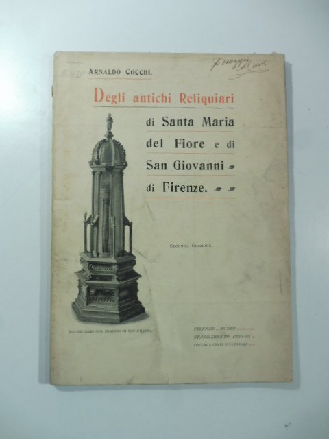 In 8, cm. 18 x 25, pp. 67 + (5), con numerose illustrazioni in bianco e nero, di cui sei a piena pagina, nel testo. Aloni ai piatti. Brossura editoriale con illustrazione in bianco e nero che raffigura il reliquiario del braccio di S Filippo. Scritta omaggio e firma dell'autore alla copertina. Seconda edizione.