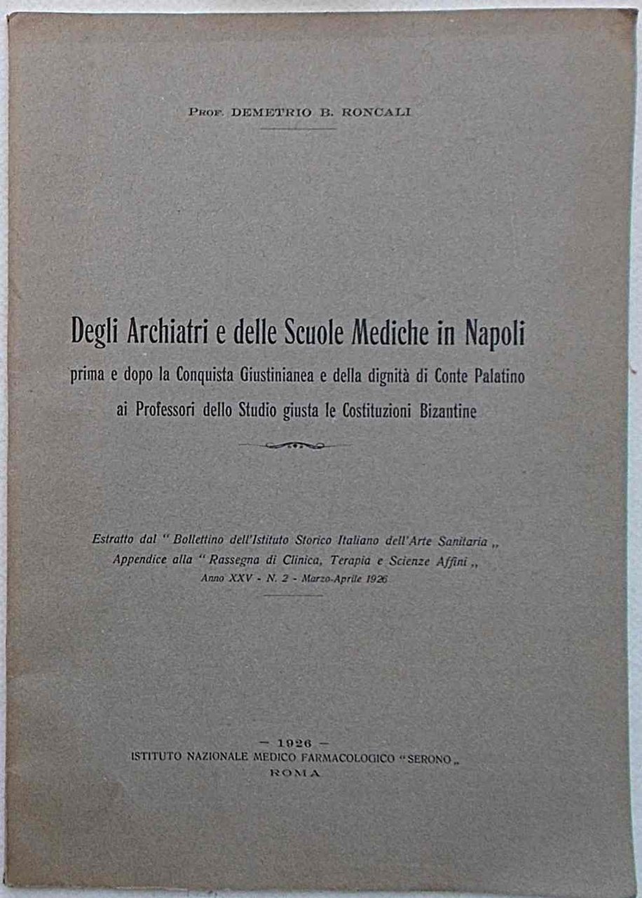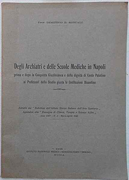 Degli Archiari e delle Scuole Mediche in Napoli prima e dopo la Conquista Giustiniana e della digintà di conte Palatino ai Professori dello Studio giusta le Costituzioni Bizantine.