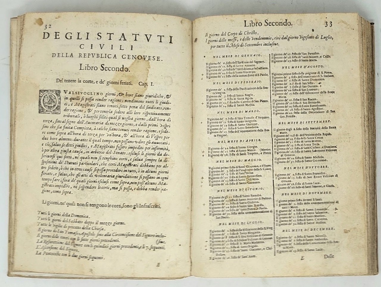 >in-folio (263x180 mm), pp. (12), 194, (14), legatura coeva in pergamena rigida, titolo ms. al dorso. Al frontespizio grande stemma di Genova inciso da Paolo Batt. Dal Solaro, impresa tipografica in fine. Vi si contengono gli Statuti riformati nel 1589 da Fr. Tagliacarne, Ant. Roccatagliata e G.B. Doria e pubblicati in sei libri in volgage, con varie modifiche apportate fino al 1595. Edizione originale. Esemplare  modesto (con i ff. prelim. 2-5 per errore del leg. posti in fine; unghia rinforzata al titolo ed antica scritta al margine sup., sensibili aloni d'umido). Cat. Senato III, 293. Manzoni I, 207. Fontana II, 22. Manno VI, 25323. Repertorio degli Statuti della Liguria, 517