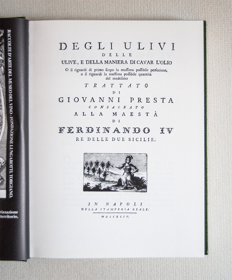 Leg. edit. con tit. al dorso. Nuovo. Ristampa dell'edizione del 1794. Edizione numerata di 300 copie. 316 pp. + 4 tavv. f.t. raffiguranti le varie qualità di olive, torchi e presse.