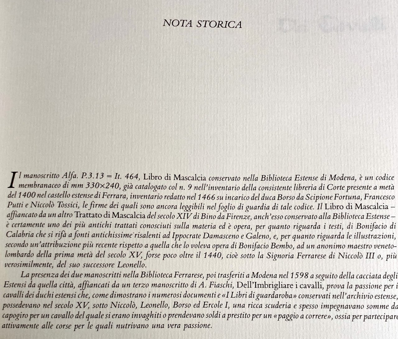 Il manoscritto Alfa. P.3.13 = It. I 464, Libro di Mascalcia conservato nella Biblioteca Estense di Modena, è un codice membranaceo di mm 330×240, già catalogato col n. 9 nell'inventario della consistente libreria di Corte presente a metà del 1400 nel castello estense di Ferrara, inventario redatto nel 1466 su incarico del duca Borso da Scipione Fortuna, Francesco Putti e Niccolò Tossici, le firme dei quali sono ancora leggibili nel foglio di guardia di tale codice. Il Libro di Mascalcia affiancato da un altro Trattato di Mascalcia del secolo XIV di Bino da Firenze, anch'esso conservato alla Biblioteca Estense, è certamente uno dei più antichi trattati conosciuti sulla materia ed è opera, per quanto riguarda i testi, di Bonifacio di Calabria che si rifa a fonti antichissime risalenti ad Ippocrate Damasceno e Galeno, e, per quanto riguarda le illustrazioni, secondo un'attribuzione più recente rispetto a quella che lo voleva opera di Bonifacio Bembo, ad un anonimo maestro veneto-lombardo della prima metà del secolo XV, forse poco oltre il 1440, cioè sotto la Signoria Ferrarese di Niccolò III ?, verosimilmente, del suo successore Leonello. La presenza dei due manoscritti nella Biblioteca Ferrarese, poi trasferiti a Modena nel 1598 a seguito della cacciata degli Estensi da quella città, affiancati da un terzo manoscritto di A. Fiaschi, Dell'Imbrigliare i cavalli, prova la passione per i cavalli dei duchi estensi che, come dimostrano i numerosi documenti e I Libri di guardaroba conservati nell'archivio estense, possedevano nel secolo XV, sotto Niccolò, Leonello, Borso ed Ercole I, una ricca scuderia e spesso impegnavano somme da capogiro per un cavallo del quale si erano invaghiti o prendevano soldi a prestito per un paggio a correre, ossia per partecipare attivamente alle corse per le quali nutrivano una vera passione.