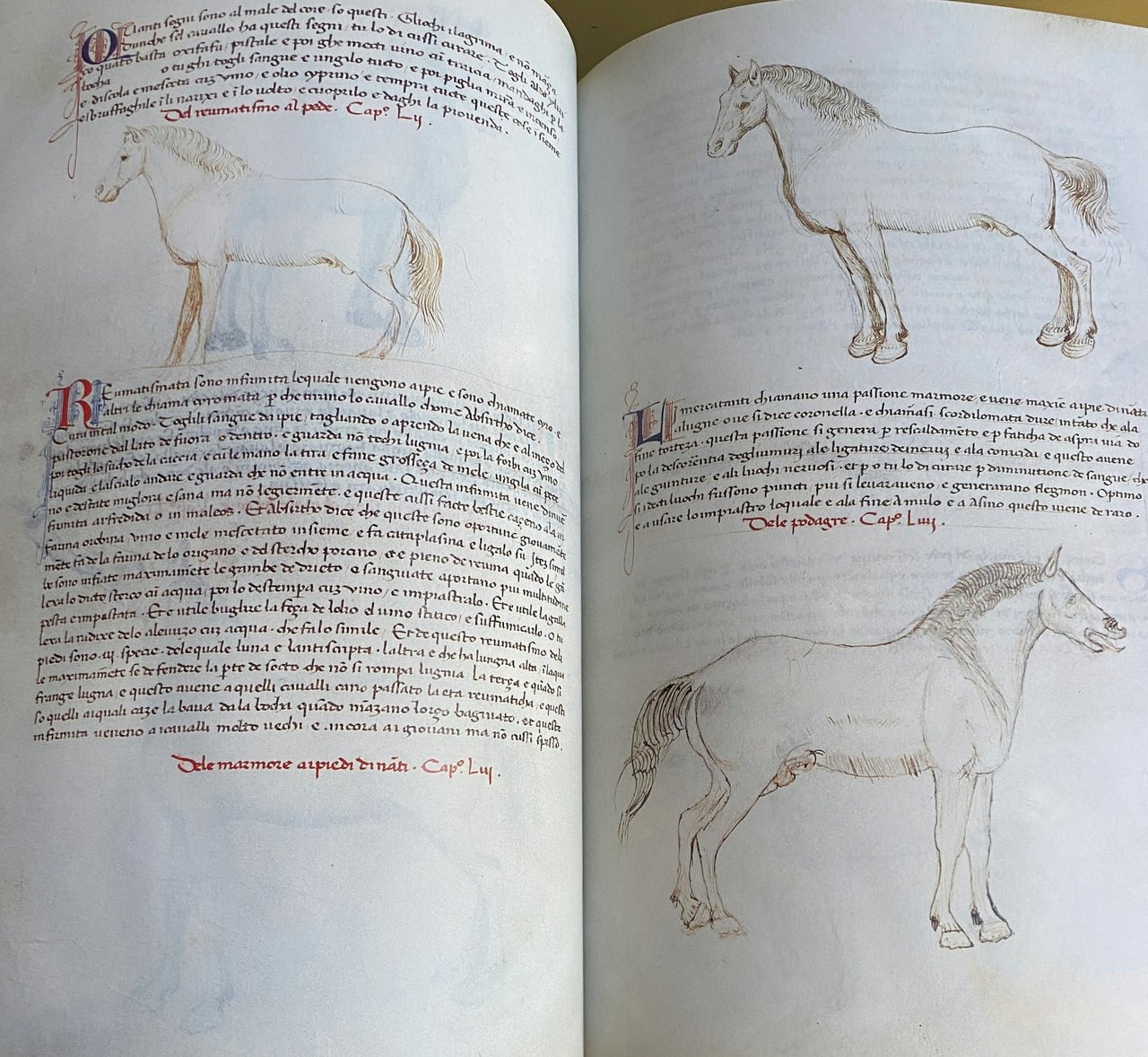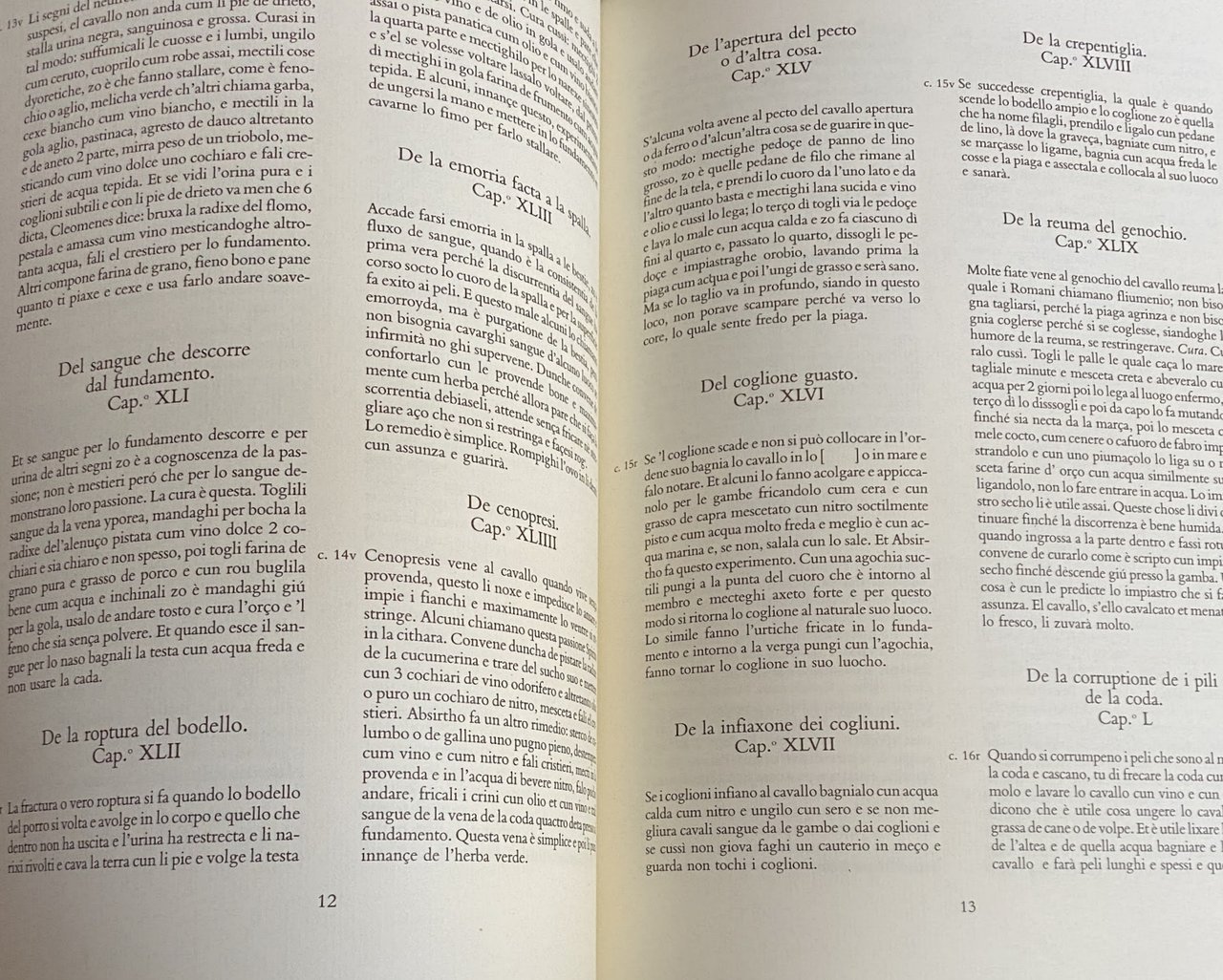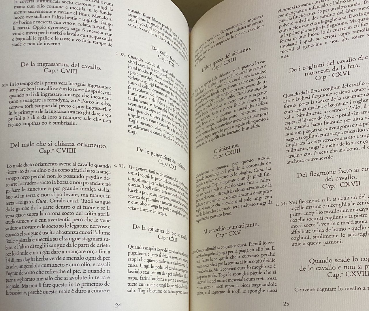 Soggetti: Collezionismo Edizioni pregiate da collezione Equitazione Medicina naturale Tempo libero Animali domestici Cura Cavalli Grandi opere Varia Manoscritti antichi Corse Codici Veterinaria Etologia Scienze Bibliofilia Manuali Facsimile Ristampe anastatiche Cavallo Razze Scuderie ferraresi Rinascimento Corti Sangue scelto Stalloni Fattrici Veloci Corridori Italia Europa Stallone Scuderia Maniscalco Garretto Salute Pratica Studio Ippocrate Damasceno Galeno Bestiario Trattati Scuola salernitana Superstizione Magia Malattie equine Rimedi naturali Affezioni Operazioni Disegni a penna Anatomia Dialetto veneto Lessico greco latino Imbrigliare Passione Documenti Guardaroba Archivio Paggio Correre Fantini Alimentazione Cibo Ferite Cadute Benessere Trucchi Consigli Biologia Puledri Pony Razza Specie Storia Aneddotica Bibliografia Riferimento Libri illustrati fuori catalogo Incunaboli Bibliologia Stampa Mascalcia Maniscalchi Ferratura Arte Zoccoli Usura Equilibrio Cavalleggeri Doma Monta inglese maremmana Americana Addestramento Butteri Sella Atleta Cavaliere Fantino Spettacoli Cavalcate Pareggiatore Piedi Mestieri Ippiatria Nutrizione Denti Riproduzione Muscoli Dolore Massaggio Allenamento Cavalieri Giovani Problematici Formazione Groom Artiere Maneggio Eventi equestri Sellaio Allevatori Gare ippiche Mascalcia Acqua fredda Bagno Cocchiere Vino Coglioni Cresta Calda Aceto Mele Olio Vino Farina Febbre Gambe Gola Grasso Umidità Orecchie Unghie Male Mirra Morsicatura Narici Piaghe Puledro Spalla Taglia Tarantola Morsi Zecche Mosche Unguento Urina Vecchio Ventre Muscolatura Altezza Garrese Andature Arti Lunghi Coda alta Attaccata Bassa Collo Trotto Fattrici Groppa Mesomorfo Morfologia Mantello Baio Morello Sauro Nevrite Purosangue Roano Saltatore Salto Ostacoli Tiro Soma Sport equestri Tarpan Testa Torace Trottatore Galoppo Briglia Castigo Natura Cavalcare Vermi Estate Bayo Ferrigno Tosse Reumatismo Ginocchio Latte Peli Polmoni Infermità Freno Mulo Bocca aperta Punture Serpenti Sintomi Polvere Tetano Avena Fieno Dieta Mucose Erba Calcio Vita Morte Morbilità Malattia Cheval Hippiatrie Criniera Manutenzione Tenuta Collectibles editions Horse riding Natural medicine Free time Pets Care Horses Miscellaneous Ancient manuscripts Racing Codices Veterinary medicine Ethology Science Bibliophilia Manuals Anastatic reprints Breeds Ferrarese stables Renaissance Courts Selected blood Stallions Mares Fast Runners Italy Europe Stable Farrier Hock Health Practice Study Hippocrates Damascene Bestiary Treatises Superstition Magic Equine diseases Natural remedies Conditions Operations Pen drawings Anatomy Venetian dialect Bridle Passion Documents Wardrobe Archive Page Running Jockeys Nutrition Food Wounds Falls Well-being Tricks Advice Biology Foals Ponies Breed Species History Anecdotes Bibliography Reference Illustrated books out of print Incunabula Bibliology Print Farrier Farriers Shoeing Hooves Wear Balance Cavalry Taming English maremmana American Training Saddle Athlete Knight Jockey Shows Rides Jockey Feet Professions Nutrition Teeth Reproduction Muscles Pain Massage Training Problem Riders Craftsman Riding school Equestrian events Saddlemaker Breeders Races Farrier Cold water Bath Coachman Wine Balls Crest Hot Vinegar Apples Oil Wine Flour Fever Legs Throat Fat Humidity Ears Nails Pain Myrrh Biting Nose Sores Foal Shoulder Size Tarantula Bites Ticks Flies Ointment Urine Old Belly Muscles Height Withers Gaits Long Limbs Tail High Set Low Neck Trot Mares Rump Mesomorph Morphology Coat Bay Black Chestnut Neuritis Thoroughbred Roan Jumper Show jumping Draft Pack equestrian Tarpan Head Chest Trotter Gallop Bridle Punishment Nature Riding Worms Summer Iron-haired Cough Rheumatism Knee Milk Hair Lungs Infirmity Brake Mule Open Mouth Snake Bites Symptoms Dust Tetanus Oats Hay Diet Mucous Grass Calcium Life Death Morbidity Mane Maintenance Estate