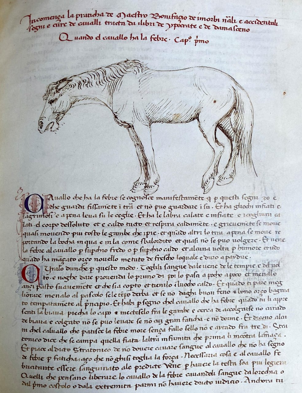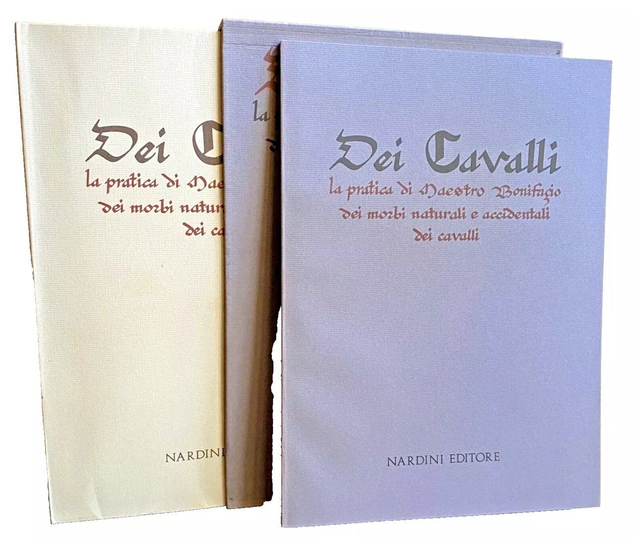 A rintracciare l'antico manoscritto di Maestro Bonifacio, maniscalco, veterinario e chirurgo della prima metà del XV secolo ed a cogliere il grande significato storico-scientifico di quest'opera dedicata ai morbi naturali e accidentali nonché a segni e cure de' cavalli è stato l'editore fiorentino Nardini allorché, dando alle stampe una preziosa monografia sulla Biblioteca Estense, venne colpito e affascinato dagli splendidi disegni che illustravano quel rarissimo codice. L'editore, d'intesa col direttore della Estense, dott. Ernesto Milano, chiese ed ottenne dalla Direzione Generale dei Beni Librari l'autorizzazione a fotografare e riprodurre in fac-simile quest'opera, unica e di alto interesse non solo per un pubblico colto e per i bibliofili, ma anche, e in particolar modo, per tutti gli esperti, gli appassionati e gli amanti del cavallo. All'origine di questo libro sta forse un episodio poco noto, ma singolare e significativo, tramandato da anonimi cronisti dell'epoca. Si tratta, appunto, delle famose scuderie ferraresi del duca Niccolò III e dei suoi giovanissimi figli Leonello e Borso d'Este scuderie alle quali tutte le Corti e le Signorie di quel secolo, dall'imperatore di Germania Massimiliano I, ai Re di Francia e Portogallo fino ai duchi di Savoia, di Milano, di Rimini e di Urbino, si rivolgevano per avere consigli, per attingere sangue scelto, per acquistare i migliori stalloni e le migliori fattrici, nonché i più veloci corridori d'Italia e d'Europa. Leonello e Borso, per immortalare un loro famoso stallone chiesero a Piero della Francesca, che stava appunto decorando una sala del loro castello, di ritrarre il cavallo su una parete della scuderia; e il pittore, maestro di prospettiva, lo dipinse a grandezza naturale con tanta abilità e con tali effetti tridimensionali da mostrarlo tanto vivo e ben fatto che un altro cavallo come scrisse l'anonimo cronista tenendolo per vero, gli tirò molte coppie di calci. Leonello e Borso, probabilmente in quell'occasione, vollero a Ferrara il più noto maniscalco e veterinario del tempo, non tanto per fargli curare il cavallo ferito al garretto, quanto per affidargli la responsabilità sanitaria della loro preziosa scuderia. Nacque così uno dei primi e più autorevoli trattati di veterinaria, perché Maestro Bonifacio detto, lo scrisse lui stesso, tutto ciò che aveva imparato in decenni di pratica nelle maggiori scuderie d'Italia, oltre a ciò che aveva desunto dallo studio dei testi greci, latini e arabi, a partire da quelli di Ippocrate, Damasceno e di Galeno, fino al bestiari del Medioevo ed ai trattati della scuola salernitana. Da uomo pratico e intelligente, Maestro Bonifacio abolì tutto ciò che sapeva di superstizione e di magia, componendo un trattato sobrio e rigoroso intorno a 153 malattie equine con i relativi 153 rimedi, molti dei quali in uso ancor oggi; e il suo testo è scritto con tale vivacità e immediatezza di linguaggio da rendere persino inquietanti le descrizioni di certe affezioni o l'esecuzione di certe operazioni. I disegni a penna che illustrano il testo sono stupendi e di un'assoluta fedeltà anatomica, indubbiamente realizzati da una mano abilissima (recentemente attribuiti ad un anonimo maestro veneto-lombardo), e sicuramente esperta di cavalli. Le tavole sono databili intorno al 1439 (l'anno in cui il Concilio Ecumenico passò da Ferrara a Firenze), mentre il testo può essere stato composto qualche anno prima. Si tratta di un'opera di rara bellezza e di fondamentale importanza per conoscere a fondo la storia dell'arte veterinaria; un libro che non può mancare nelle biblioteche di ogni amante di libri antichi e rari e di ogni appassionato di cavalli, di ogni cavaliere, di qualsiasi operatore nel campo del cavallo da corsa, da sella, d'attacco. Il testo è stato trascritto nel fascicolo a stampa allegato al fac-simile.