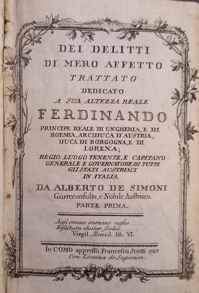 Dei delitti di mero affetto. Trattato dedicato a Sua Altezza Reale Ferdinando Principe Reale di Ungheria. In Como, Appresso Francesco Scotti, 1783 - 1784.
