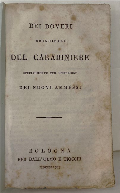 in-16, pp. 24, leg. carta muta coeva. Rara pubblicazione uscita nello stesso anno del riordinamento dell'Arma a cura del Re Carlo Alberto: probità di costumi, cieca obbedienza ai superiori, civiltà, cautela nelle azioni, gravità del pportamento, polizia nel vestiario. [549]