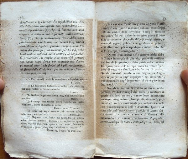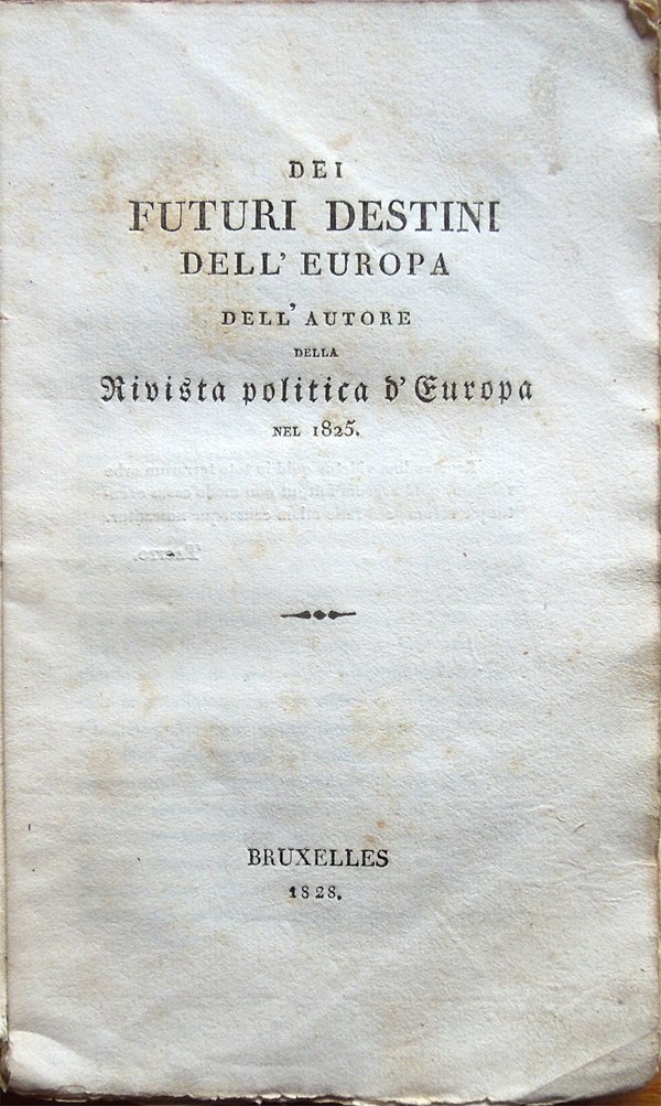 In-16° (17 x 10 cm), pp. 182, (2), brossura muta coeva con dorso rifatto. Qualche normale segno d'uso e del tempo alla brossura, in particolare, piccola mancanza nell'angolo inferiore della copertina anteriore. I margini interni delle pp. 46-47 presentano una brunitura probabilmente causata dall'ossidazione della carta di un foglio volante anticamente inserito a questa altezza. Nel bordo inferiore delle pagine dalla 63 alla 68, lontano dal testo, piccola macchia d'inchiostro di forma semicircolare. Per il resto buon esemplare in barbe. La prima edizione di quest'opera fu pubblicata nel 1828 a Bruxelles con il titolo Des destinées futures de l'Europe. Par l'auteur de la Revue Politique de l'Europe en 1825. Lo scritto analizza la situazione politico-istituzionale dell'Europa del tempo, riservando particolare attenzione alle condizioni dell'istituto monarchico e condannando i continui tentativi della Chiesa di Roma di influenzare i regnanti e di interferire nelle loro decisioni.