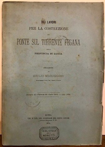 8vo (cm. 24,2), 54 pp. Con 2 tavv. f.t. ripiegate. Brossura editoriale. Mancanza alla parte superiore del frontespizio con perdita parziale di testo, altrimenti buon esemplare. Estratto dal Giornale del Genio Civile. Provenienza: Collezione Moretti, Roma (timbretti ex libris sulla cop. anteriore e al frontespizio).