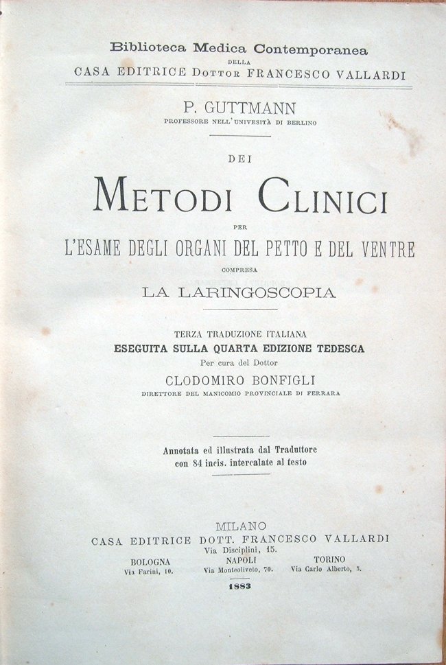 In-8° (cm 22x14,9), pp. XV, (1), 476, legatura coeva in mezza tela con normali tracce d'uso. Con 84 figure in bianco e nero nel testo. Firma coeva d'appartenenza alla guardia anteriore. Alla figura 35, segni e numeri a matita colorata apposti da vecchio proprietario. Nel margine interno della carta che ospita le pp. 175-176, in quello superiore delle carte con le pp. 223-224 e 227-228, lontano dal testo, piccola mancanza reintegrata con carta giapponese. Piccoli segni d'umido alle pagine, nel complesso esemplare ben conservato. Indice: Avvertenza dell'editore; Prefazione alla prima edizione tedesca; Prefazione alla quarta edizione; Introduzione; Esame generale; Ispezione. Mutamenti nel colorito della pelle; Costituzione e stato della nutrizione; Esame del tessuto connettivo sottocutaneo. Esame dell'apparecchio respiratorio. Ispezione del torace; Palpazione del torace; Percussione del torace; Ascoltazione dei polmoni; Esame degli sputi. Esame dell'apparecchio circolatorio. Ispezione della regione cardiaca; Palpazione della regione cardiaca; Percussione del cuore; Ascoltazione del cuore. Esame degli organi addominali. Ispezione dell'addome; Palpazione dell'addome; Percussione dell'addome; Ascoltazione degli organi addominali; Esame delle materie escrementizie. Esame della laringe. Malattie della laringe. Titolo completo: Dei metodi clinici per l'esame degli organi del petto e del ventre compresa la laringoscopia. Terza traduzione italiana eseguita sulla quarta edizione tedesca per cura del Dottor Clodomiro Bonfigli, direttore del Manicomio provinciale di Ferrara, annotata ed illustrata dal Traduttore. Con 84 incis. intercalate al testo.