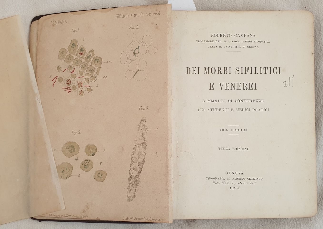 Edizione del 1894 di questo interessante studio sui morbi sifilitici e venerei scritto da Roberto Campana. All'interno 15 conferenze. Alcune illustrazioni tra le quali una planche a colori in antiporta. In discrete condizioni. Copertina editoriale in discrete condizioni generali con usure ai margini e dorso. Macchie. Legatura in buone condizioni ma la planche in antiporta staccata dalla legatura. All'interno le pagine si presentano in buone condizioni con rare fioriture. In 16. Dim.18x13 cm. Pp. XIV+(2)+416.