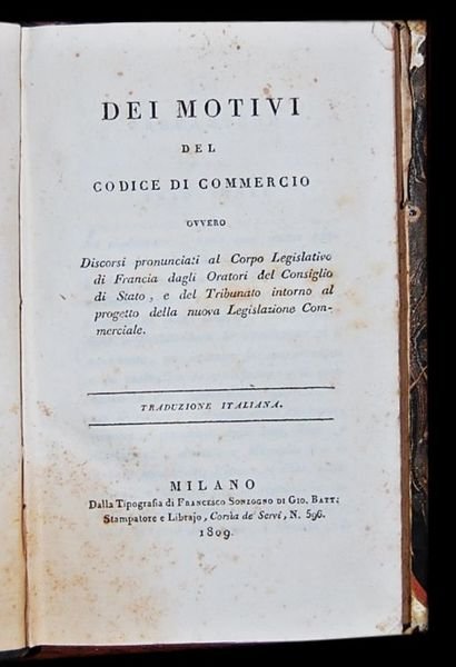 Dei motivi del codice di commercio ovvero Discorsi pronunciati al corpo legislativo di Francia dagli oratori del Consiglio di stato, e del Tribunato intorno al progetto della nuova legislazione commerciale. Traduzione italiana