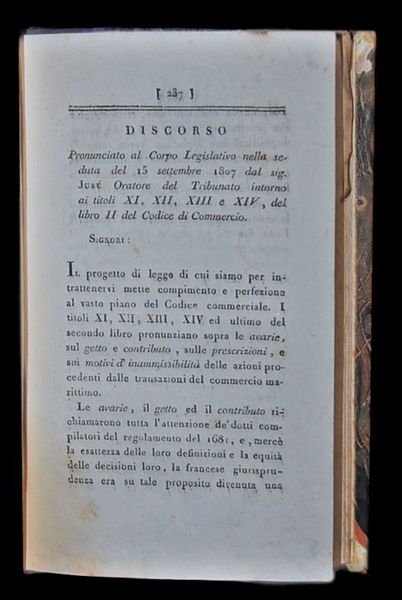 In 8° (19,5x12 cm); (4), 326, (2) pp. Bella legatura coeva in mezza pelle verde scuro con titolo in oro su fascetta in pelle rossa e ricchi fregi in oro al dorso. Piatti foderati con carta marmorizzata coeva. Qualche lieve macchiolina di foxing, qualche brunitura ed un leggero alone al margine basso delle ultime tre carte, leggero. Nel complesso esemplare in buone condizioni di conservazione. Prima edizione italiana delle celebri 17 Discorsi pronunciati da diversi oratori, dal dal 29 agosto al 15 sett. 1807 davanti al Corpo Legislativo di Francia. Nei discorsi, gli oratori, descrivono ed analizzano le ragioni del Nuovo Codice di Commercio napoleonico. Regnaud che sintetizza le diverse posizioni arriva a dimostrare come il codice di commercio, progettato in Francia fin dal 1802 e emanato nel 1807, sia un codice estremamente progressista che contiene una visione mondiale del commercio, con unidea dello stesso che va ben oltre ogni altro codice commerciale emanato in qualsiasi nazione fino a quel momento. Il figlio del Conte Michel Regnaud de Saint-Jean-d'Angely fu un alto ufficiale di Napoleone che lo seguì anche allIsola dElba. Anche per questo il Conte subì le conseguenze della restaurazione. Prima edizione non comune, in bella legatura.