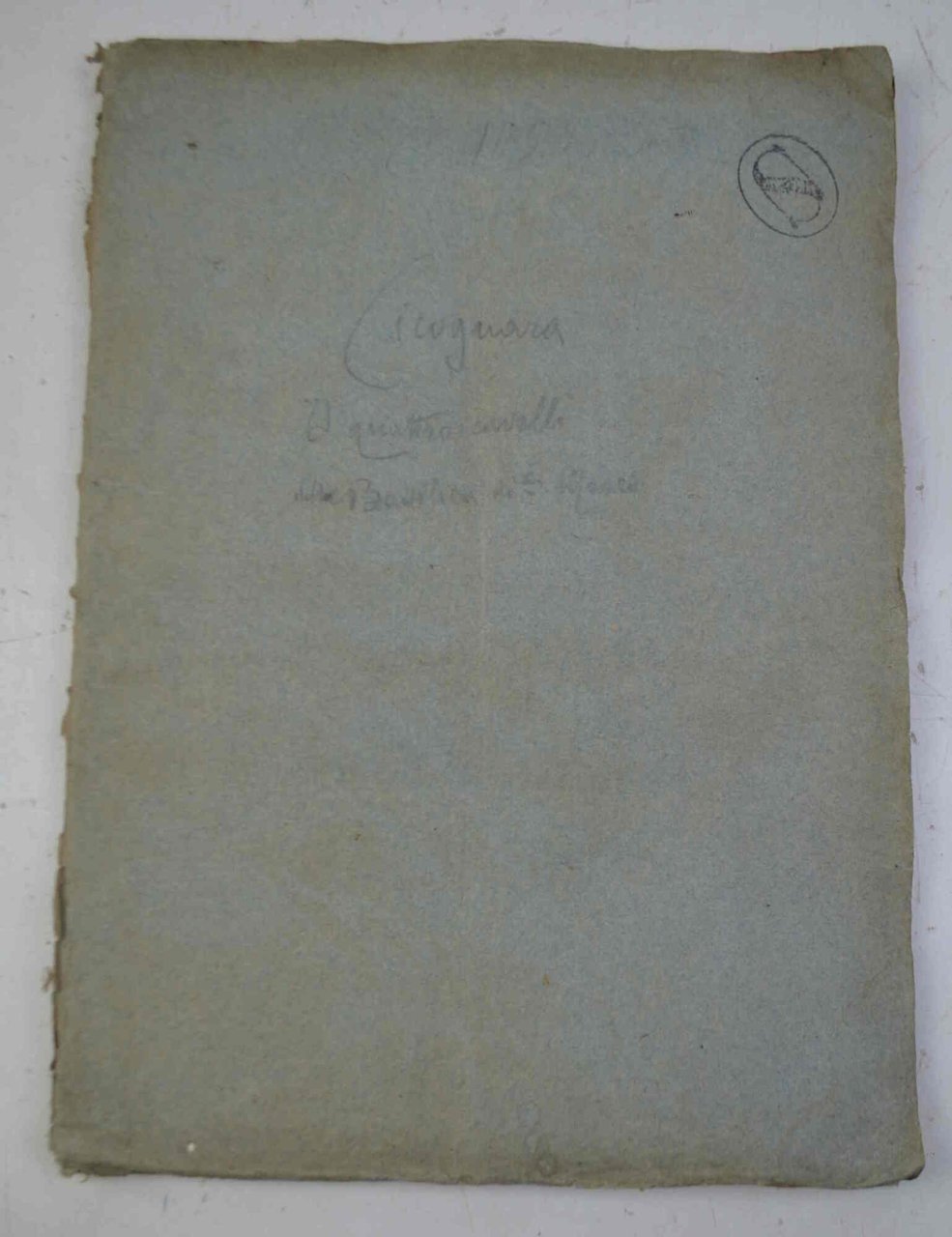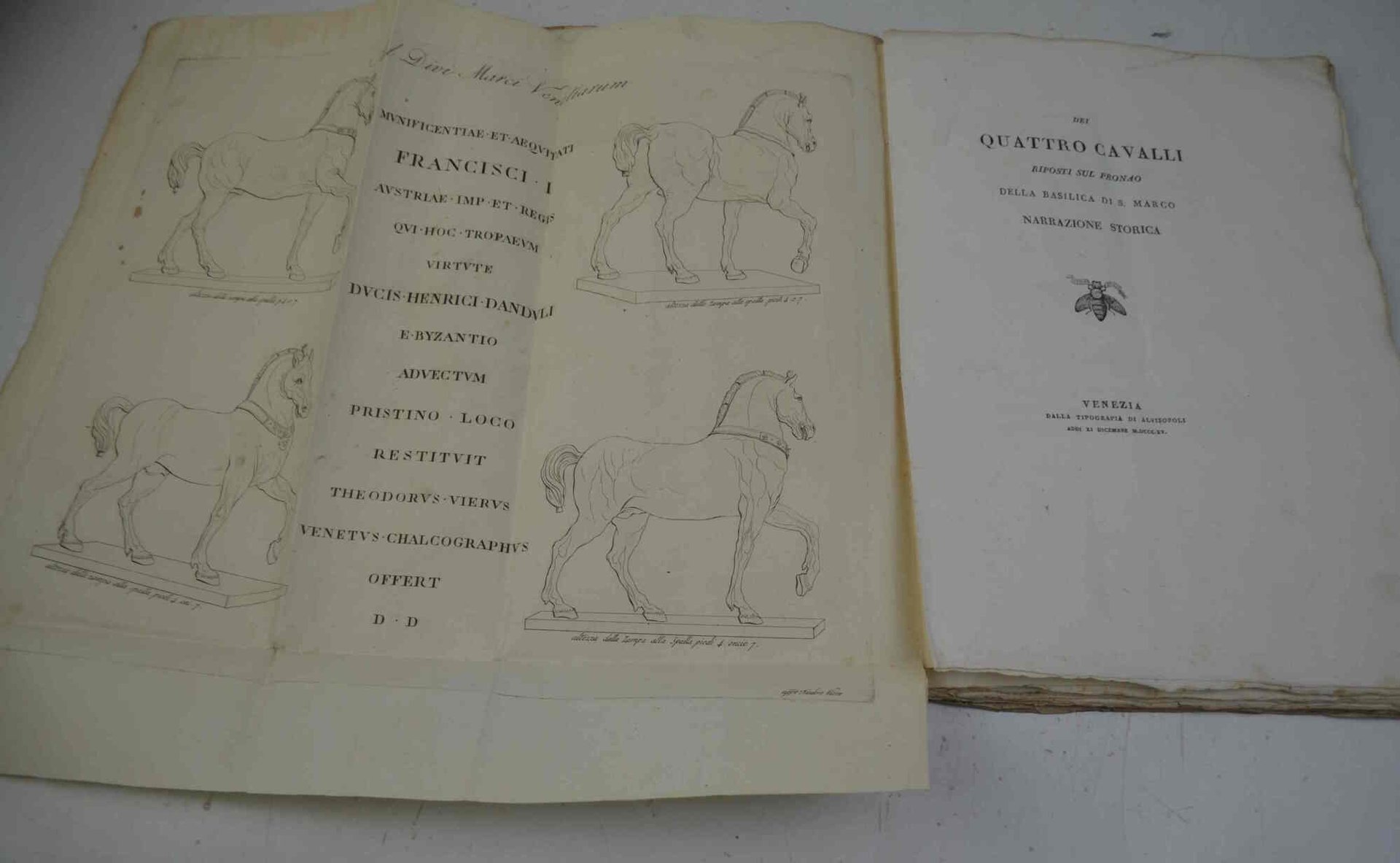 Cm. 31, pp. 36. Con una tavola incisa e ripiegata f.t. in antiporta raffigurante i quattro cavalli. Leg. in carta leggera azzurra coeva. Esemplare stampato in carta grande e con la particolarità di possedere la tavola f.t. che nessuna bibliografia e nessuna delle copie censite cita, nemmeno Vianello.