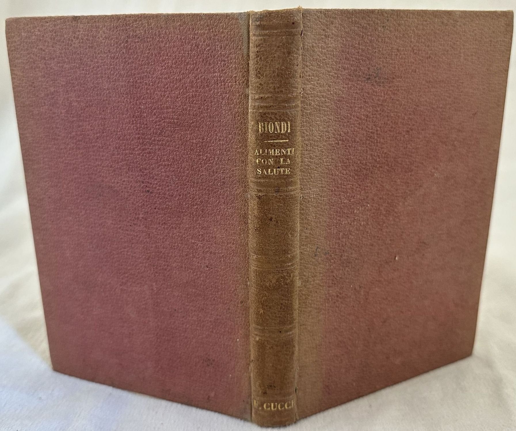 Prima edizione del 1865 di questo interessante studio di alimentazione del Dott. Iacopo Biondi. All'interno: Esame sommario delle funzioni vitali, Cagioni del calore animale; Elementi respiratori; Elementi plastici; Statica chimica della nutrizione; Elementi minerali; Effetti degli alimenti considerati in rapporto dei principi inorganici che contengono; Pericoli del regime esclusivo e dell'uso troppo largo di alcuni alimenti; Temperamenti primitivi; regime più conveniente ad essi; Bevande ecc. In ottime condizioni. Copertina in piena tela con titolo in oro al dorso in buone condizioni generali con lievi usure ai margini e dorso. Legatura in buone condizioni. All'interno le pagine si presentano in ottime condizioni con rare fioriture. In 16. Dim. 17,5x12 cm. Pp. 332+(4). First edition of 1865 of this itnerestinf study of feeding by Dott. Iacopo Biondi. Inside: Esame sommario delle funzioni vitali, Cagioni del calore animale; Elementi respiratori; Elementi plastici; Statica chimica della nutrizione; Elementi minerali; Effetti degli alimenti considerati in rapporto dei principi inorganici che contengono; Pericoli del regime esclusivo e dell'uso troppo largo di alcuni alimenti; Temperamenti primitivi; regime più conveniente ad essi; Bevande ecc. In very good conditions. Full cloth cover with gilted title and decorations in the spine in good general conditions lightly worn in the extremities. Binding in good conditions. Pages in very good conditions with occasional foxing. In 16. Dim. 17,5x12 cm. Pp. 332+(4).
