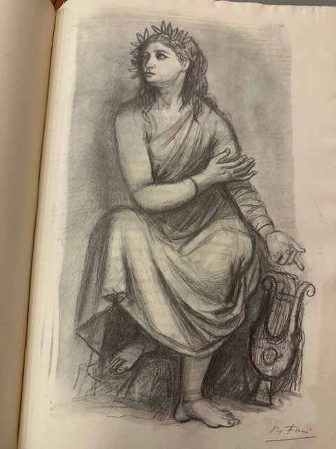 Ottima copia con brossura editoriale a risvolti con velina di protezione, camicia e custodia in cartonato, titolo in oro in verticale alla camicia, in barbe e in ottimo stato. Con 2 tavole litografiche originali numerate e firmate da Achille Funi n.t. Composizione manuale di Franco Riva con caratteri Bodoni su carta a tino Magnani di Pescia. Editiones Dominicae, I Poeti Illustrati. Esemplare n. 134 di 150.