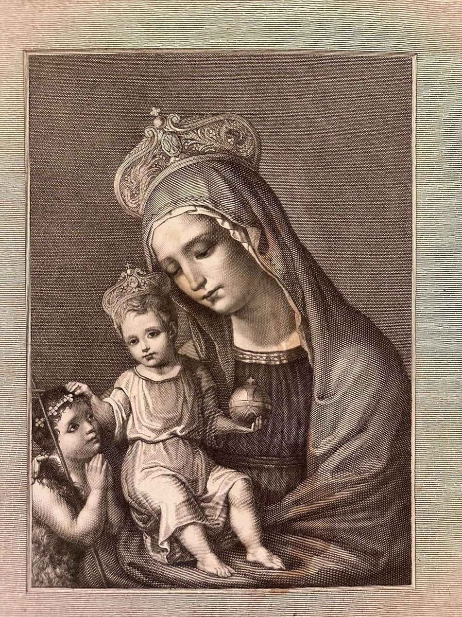 Bella incisione all'acquaforte che rappresenta la Madonna con il bambino e San Giovannino. Autore: Anonimo Data: 1840 circa Tecnica: acquaforte Dimensione del foglio: 27,5x19,5 cm Dimensione incisione: 23,5x18 cm Condizioni: Buone. Alcune fioriture. Beautiful etching engraving representing Madonna with child and San Giovannino. Author: Anonymous Date: 1840 circa Technique: etching engraving Page size:27,5x19,5 cm Engraving size: 23,5x18 cm Conditions: Good conditions. Some foxing.