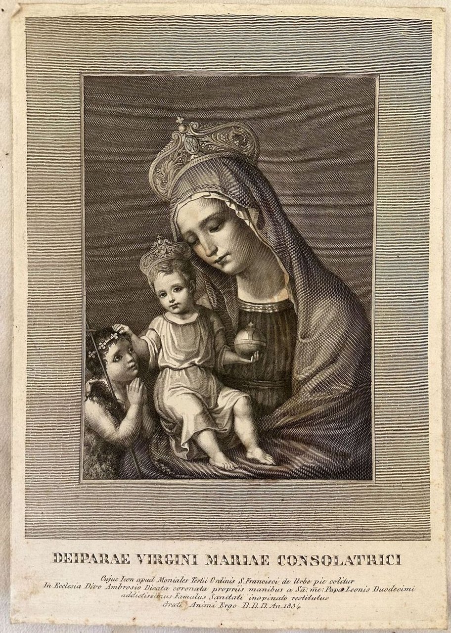 DEIPARAE VIRGINI MARIAE CONSOLATRICICujus icon apud Moniales Tertii Ordinis S. Francisci de Urbe pie colitur in Ecclesia Dive Ambrosio Dicata coronata propriis manibus a Sa. me. Papae Leonis Duodecimi addictissimus Famulus Sanitati inopinato restitut
