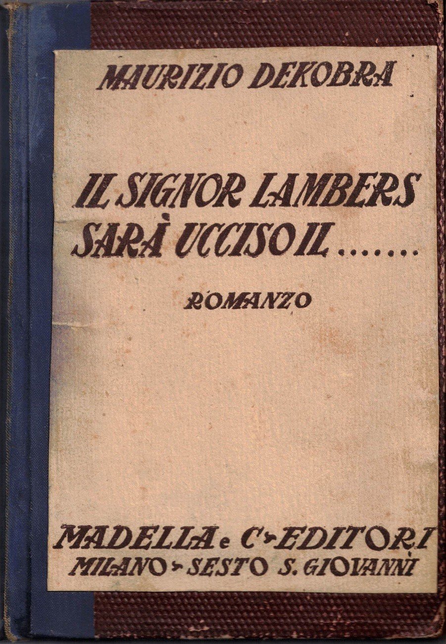 Maurizio (Maurice) Dekobra (Ernest-Maurice Tissier), Il signor Lambers sarà ucciso il… Romanzo, Madella e C. Editori, Sesto S. Giovanni 1929, pp. 285, cm 20, legatura in mezza tela blu con copertina originale applicata al piatto anteriore. Timbro di appartenenza all’occhiello. Timbro di editore al verso del frontespizio. Ordinarie tracce d’uso alla legatura con minime abrasioni ai margini, una piccolissima mancanza alla carta dell’indice, minime fioriture, leggera brunitura della carta, per il resto buon esemplare.