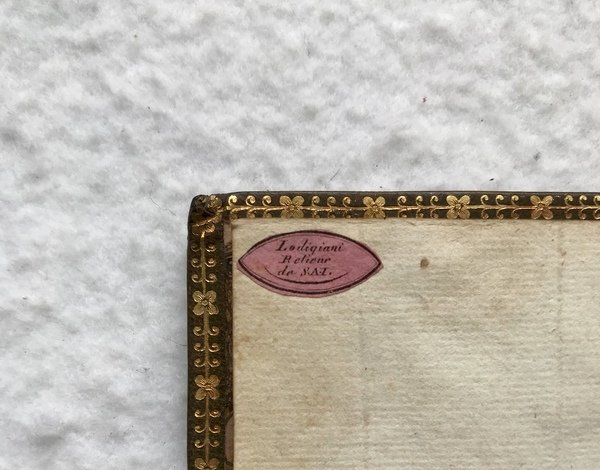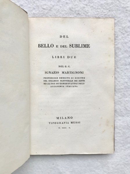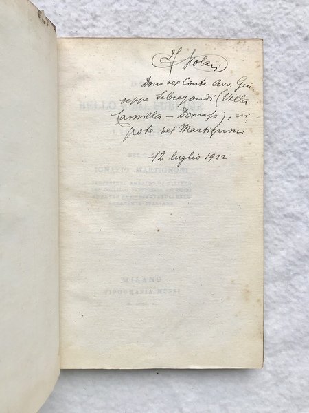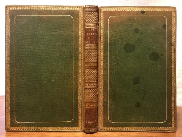 Prima edizione (la seconda stampata a Como nel 1826) di quest’opera di argomento estetico di Ignazio Martignoni, professore emerito di diritto del Collegio Elettorale dei Dotti e anche dei Conservatori dell’Accademia Italiana. Il nipote dell’autore, Giuseppe Maria Sebregondi, acquistò una villa a Domaso sul lago di Como nel 1903 e la nominò “Camilla” in onore della prima moglie, contessa Barbiano di Belgioioso. Come si apprende dal Dizionario Biografico degli Italiani della Treccani, alla voce “Martignoni, Ignazio”, l’opera riprende le linee della discussione settecentesca sugli omonimi temi, “innestandole nel dibattito sulle arti sviluppatosi in Italia nei primi decenni dell’Ottocento. Può essere affiancato, per alcuni contenuti e per il suo stile discorsivo, ad altri esempi più o meno coevi, come quello del ferrarese L. Cicognara (Del bello. Ragionamenti, 1808, dedicato a Napoleone) o di G. Talia (Saggio di estetica, 1822). Similmente, il suo successo può essere fatto corrispondere al bisogno di erudizione in campo artistico che contrassegnava il nuovo pubblico borghese in numerose regioni della penisola. Il principio della bellezza è individuato dal M. nell’armonia, concepita in base al criterio classicista della varietà ricondotta all’unità. Tale criterio è assunto a partire da un’ottica empiristica: la curiosità, il bisogno di fuggire la noia e la limitazione delle facoltà dell’uomo rendono piacevoli i rapporti percepiti nell’oggetto. Allineandosi alle tesi di F. Soave, il M. riconosce il bello negli oggetti capaci di produrre non solo sensazioni piacevoli, ma piacevoli rappresentazioni (riservate alla vista e all’udito). Il gusto ha un ruolo centrale nella selezione dei tratti e delle forme presenti in natura, nel perseguimento di uno stile sia bello sia sublime.” Su Lodigiani, si vedano le buone descrizioni delle legature Lodigiani della Biblioteca Panizzi e Decentrate di Reggio Emilia (accessibili sul sito internet): “L’attività di Lodigiani iniziata nei primi anni dell’ottocento, si svolse prevalentemente nell’ambito della Corte milanese di Sua altezza Imperiale Eugène de Beauharnais, Viceré d’Italia, dal 1805 al 1814, del suo consigliere, conte Étienne Méjan, per il bibliofilo milanese Conte Gaetano Melzi, per la Regia Stamperia e per la Biblioteca di Brera. Le etichette di Lodigiani compaiono tra il 1808 ed il 1815 (è del 20 ottobre 1808 la richiesta a Eugène de Beauharnais di fregiarsi del titolo di «Relieur de S.A.I. a Milan») nel periodo napoleonico su legature che ricoprono prevalentemente testi antichi (incunaboli ed edizioni aldine) e testi moderni stampati tra il 1803 ed il 1815. Hanno forma ellittica, dimensione 20x8 mm di vari colori: azzurro, giallo, rosa, lilla, verde: non sembra di poter attribuire alcun particolare significato alla diversità della tinta.”