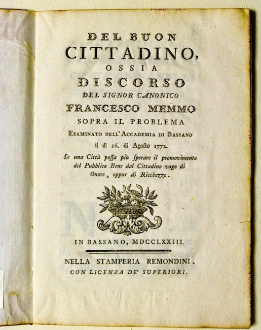 In 8° (mm 180x123); pagg. 31. Bella vignetta silografica con veduta cittadina. Brossura coeva rossa decorata.<BR>Si tratta del "Discorso del signor canonico Francesco Memmo sopra il problema esaminato dall'Accademia di Bassano il dì 26 di agosto 1772 se una Città possa più sperare il promovimento del Pubblico Bene dal Cittadino vago di Onore, oppur di Ricchezze".<BR>Ottime condizioni. <BR>