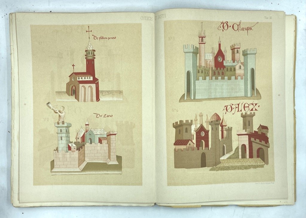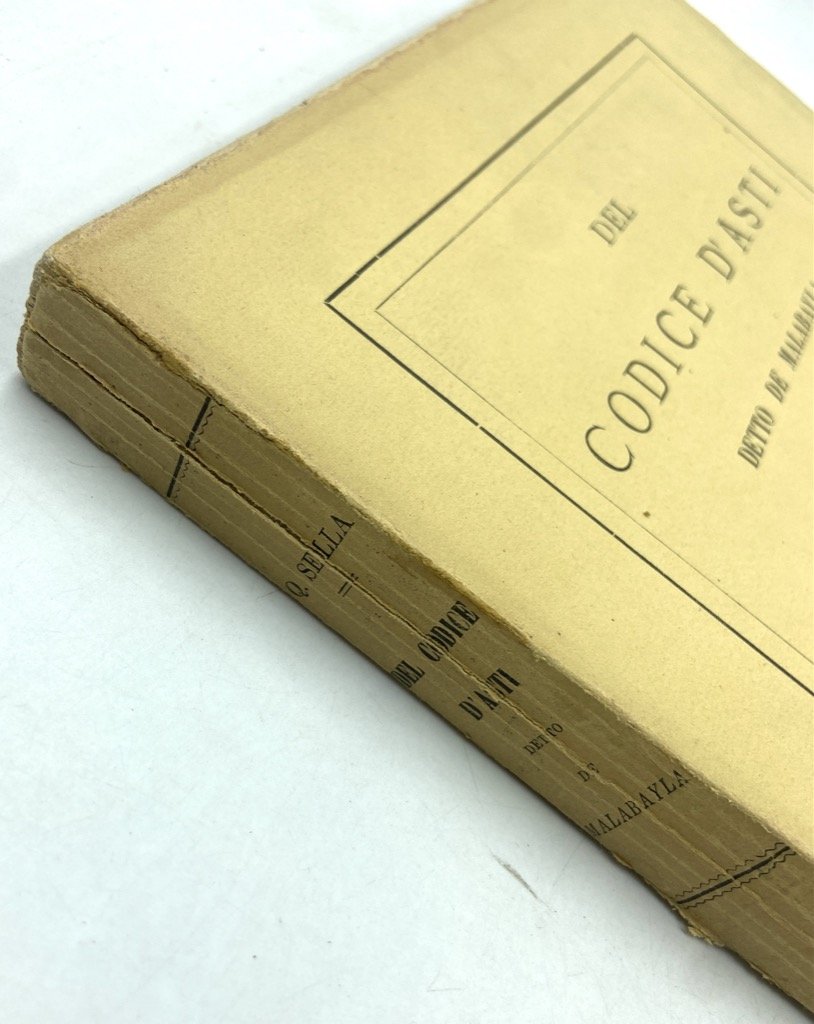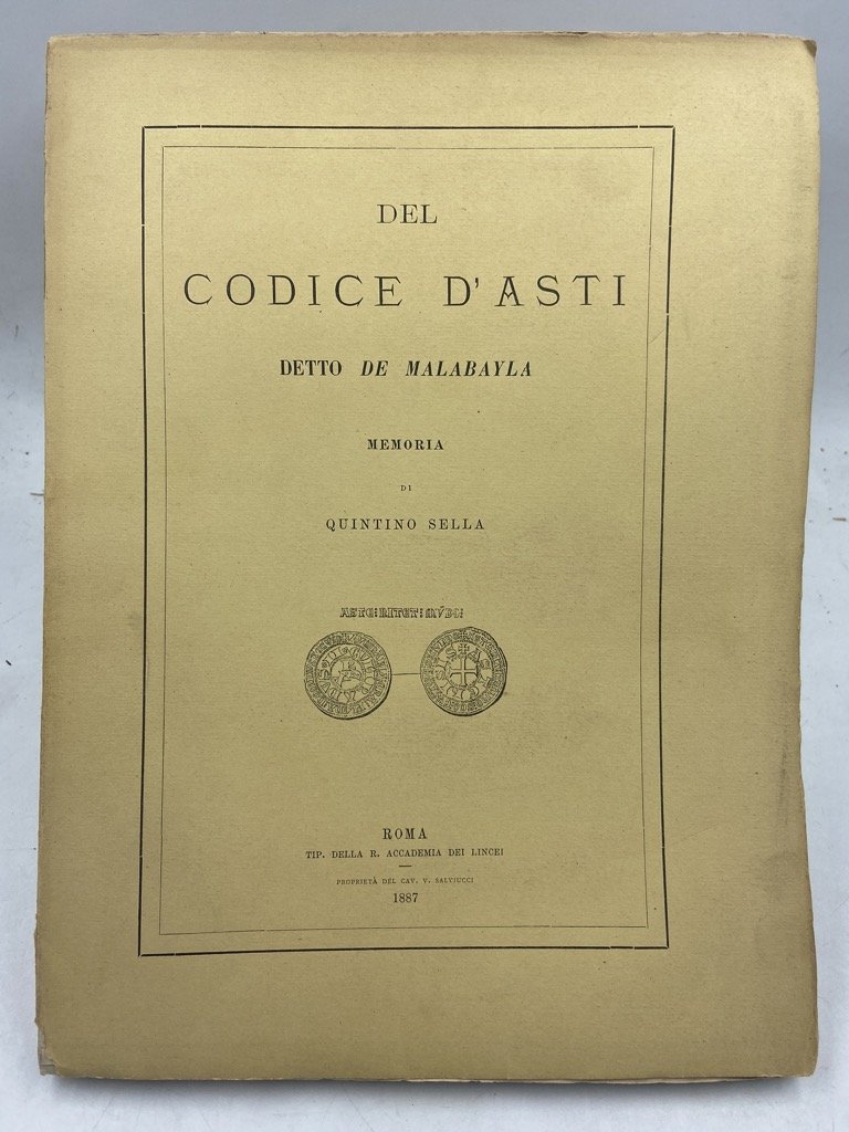 Brossura editoriale a stampa con vignetta sul piatto anteriore (difetti), cm 30 x 22.5, pp 16 CCCIV, 1 tavola litografica a colori fuori numerazione (riproduzione dal Codice Alfieri), 1 tavola più volte ripiegata con la carta dei territori della Repubblica d'Asti nel 1300, e 4 tavole numerate: 3 a colori (2 su doppia pagina) con riproduzione di miniature dal codice Malabaila e 1 in nero (su quattro pagine) con 44 riproduzioni di castelli dalle miniature del codice. Discreto esemplare. Difetti sulla brossura (piccole mancanze ai bordi, strappi lungo il dorso e le cerniere, qualche arrossamento e pagine dai bordi irregolari per l'apertura dei fascicoli col tagliacarte. Il Codice Malabaila fu compilato attorno al 1353 come copia dell'antica raccolta di atti, trattati, lettere e diplomi imperiali e papali relativi alla storia di Asti nota come Codex Vetus, perduto ma già trascritto nel 1292 in un secondo codice, conosciuto come Cronaca di Oggerio Alfieri (di cui sopravvivono frammenti). Il Codice Malabaila era custodito nell'Archivio di Corte di Vienna quando Quintino Sella, in missione diplomatica in Austria, lo ricevette in dono dall'Imperatore Francesco Giuseppe, nel 1876. Ritornato in Italia Sella propose la pubblicazione all'Accademia dei Lincei, che l'editò nei propri Atti (Serie Seconda, vol. IV-VII) grazie al lavoro dei paleografi Luigi Re, Alessandro Corvisieri, Pietro Amat di S. Filippo e Pietro Vayra. Alla morte di Quintino Sella (1884) il Codice fu donato dagli eredi alla Città di Asti e la Memoria Illustrativa che lo statista aveva composto «direttamente, con mente eletta, con longanime preparazione e colla sua proverbiale tenacità di propositi» (Manno) fu pubblicata postuma, nel 1887, a cura di P. Vayra. Edizione a se stante della sola Memoria, con numerazione romana delle pagine e minor numero di tavole rispetto a quella annessa all'edizione del codice.