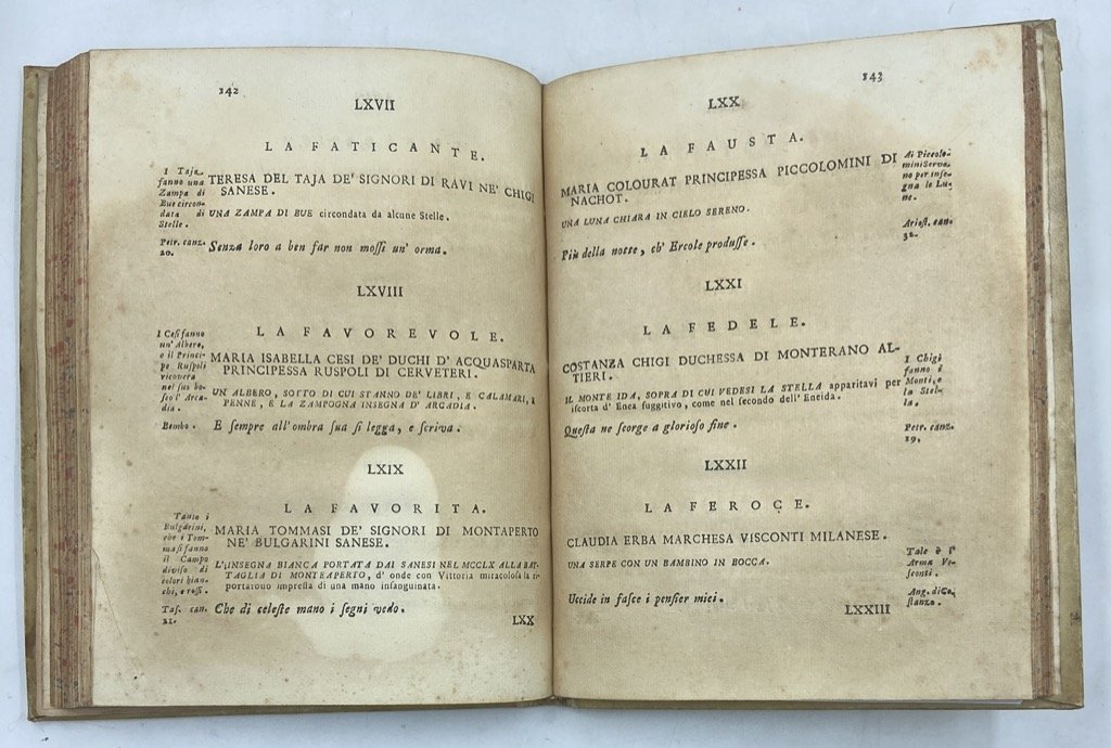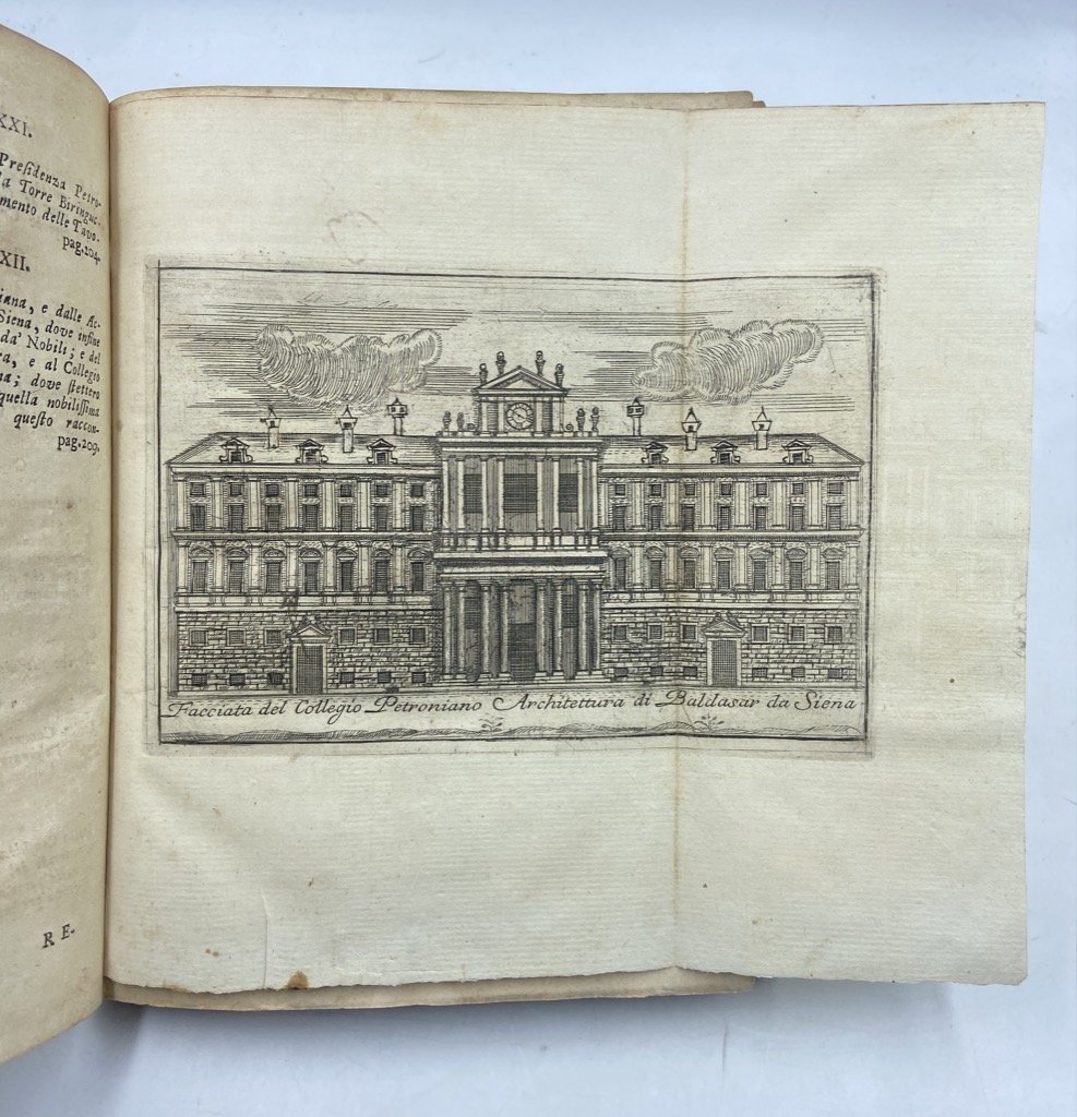 Legatura coeva in piena pergamena rigida con titoli dorati entro cornice sul dorso (un po' brunito e con etichetta cartacea), in quarto cm 23x17, pp (8) 213 (3): 2 tavole ripiegate. Pecetta con motto latino e alcune note a matita sulla prima sguardia. Segnatura: +4 A-Dd4. Esemplare genuino, alcune bruniture sulle carte, macchie d'inchiostro su una delle tavole (tentata cancellatura dei volti delle balie); discreto-buono stato nel complesso. Girolamo Gigli fu vivace polemista, difensore dei letterati e vocaboli senesi contro il fiorentinismo della Crusca (il dibattuto - e pubblicamente arso - Vocabolario Cateriniano gli valse l'espulsione dall'Accademia). Curatore delle opere di Caterina da Siena (1717- 21) e Celso Cittadini (1721), traduttore e autore poliedrico di pungenti commedie e satire, studi critici e linguistici, in più opere espresse un certo gusto per il fantastico, come in questa bizzarra satira rivolta alla gesuitica ratio studiorum e in generale alla predilezione per il latino quale lingua colta. «formò il Gigli quest'opera sulla norma della repubblica di Platone, e, pubblicatola sotto il falso nome di Salvatore Tonci, volle far credere che esistesse in Siena un conservatorio per allevare i fanciulli nel morto linguaggio del Lazio: e lo scherzo fu si ben colorito, che indusse taluni a prestargli fede.» (Gamba, 2260). Seconda edizione, notevolmente accresciuta con resoconto delle feste e elenco delle Gentildonne dell'Accademia, con motto e descrizione della propria insegna.